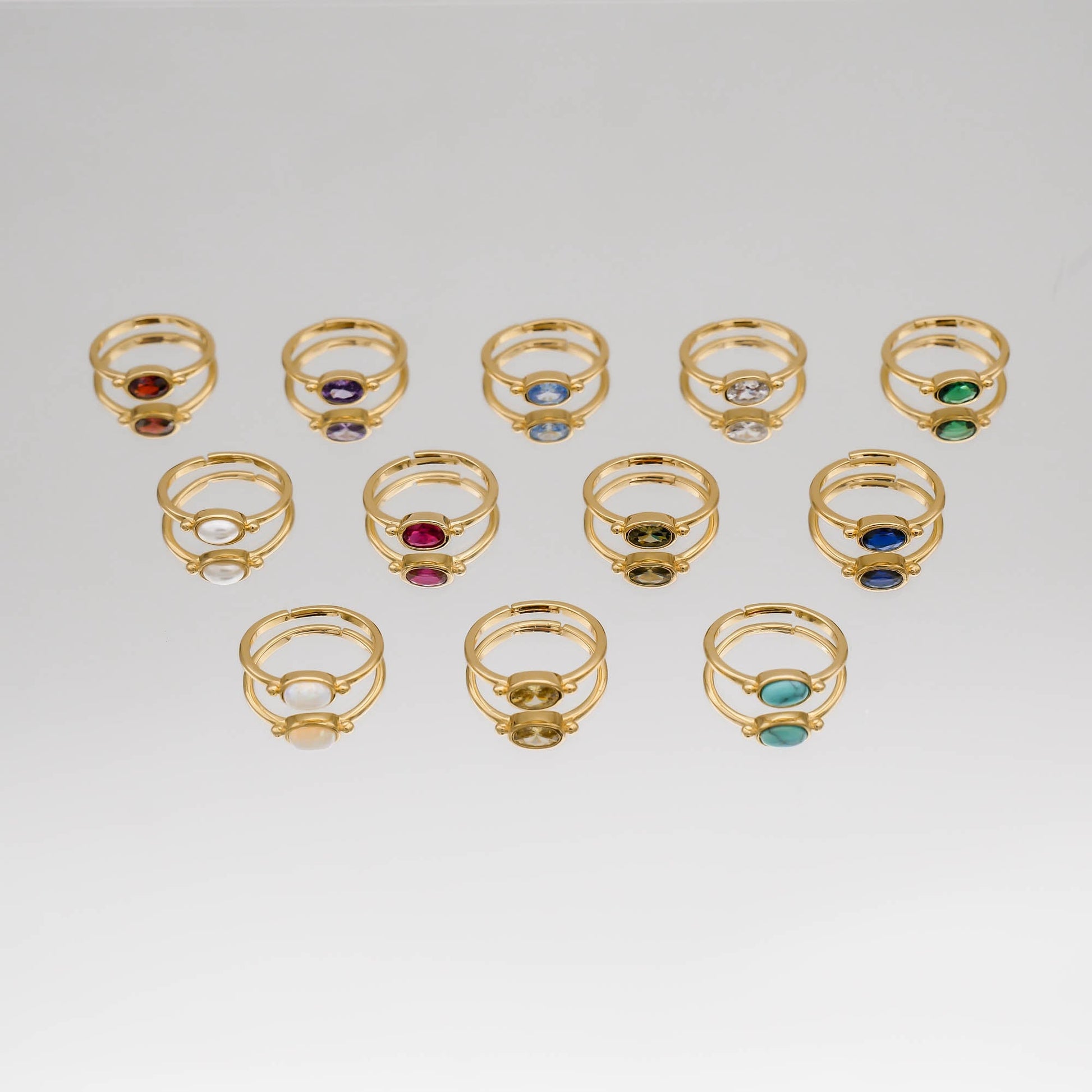 Our Birthstone Ring Gold is the perfect personalised birthstone jewellery; great for everyday wear, featuring all the traditional gem birthstones for each month. Each high-quality gem is a bezel set into an adjustable gold band ring. The crystal clear colour and sparkle of the gems will add a hint of shine to any outfit and is also available in Silver