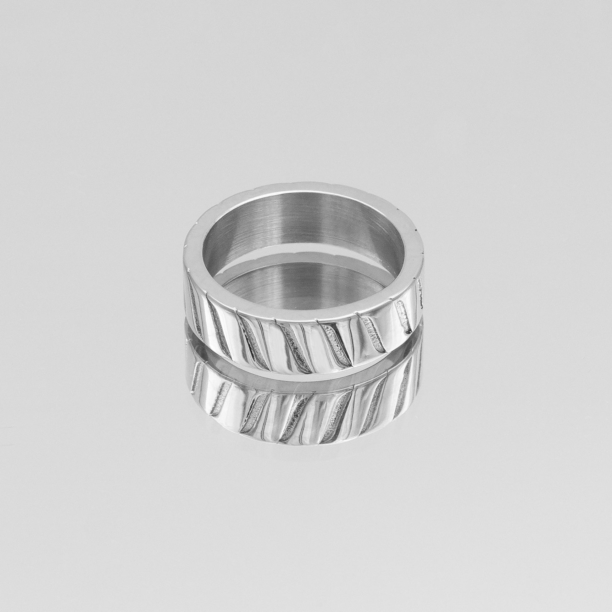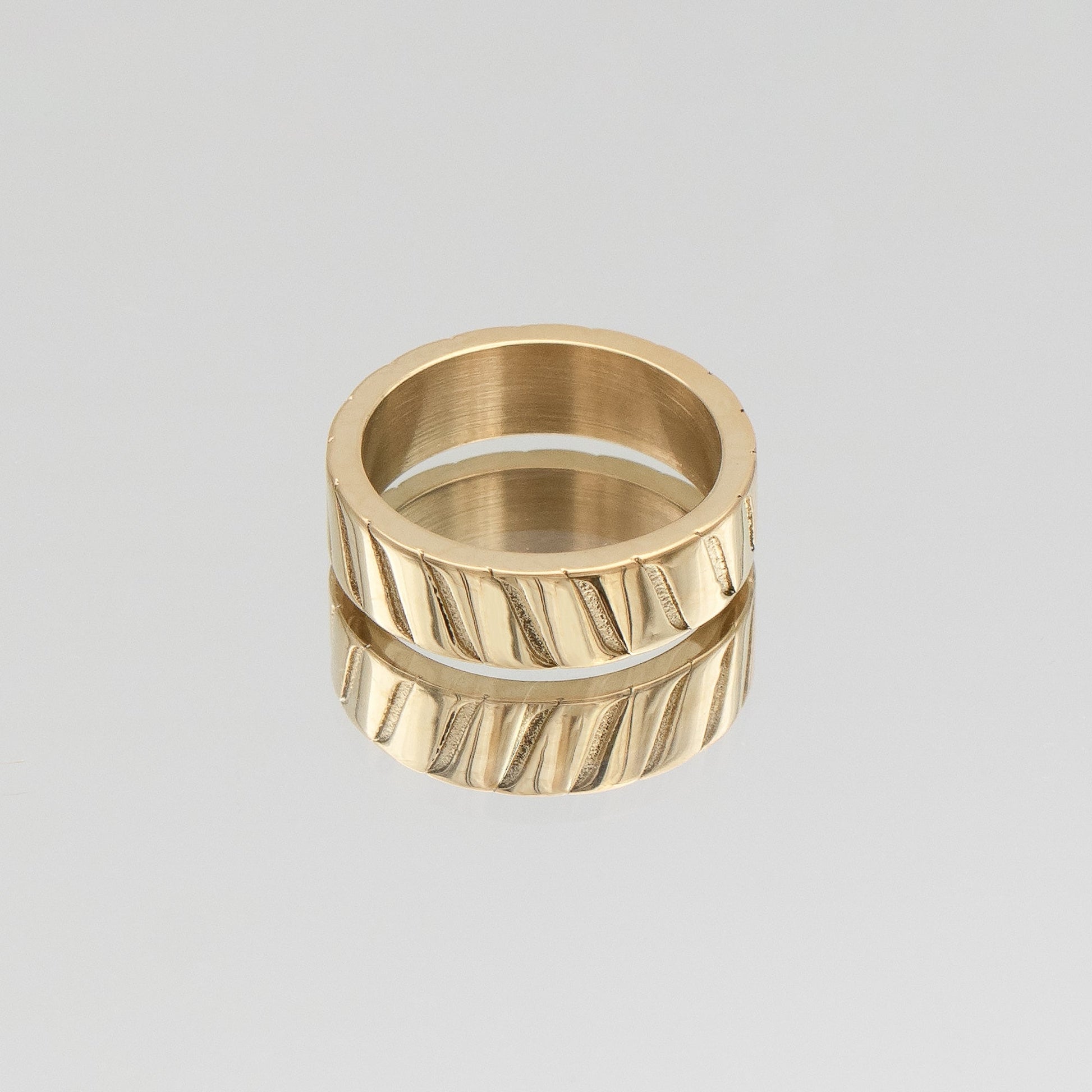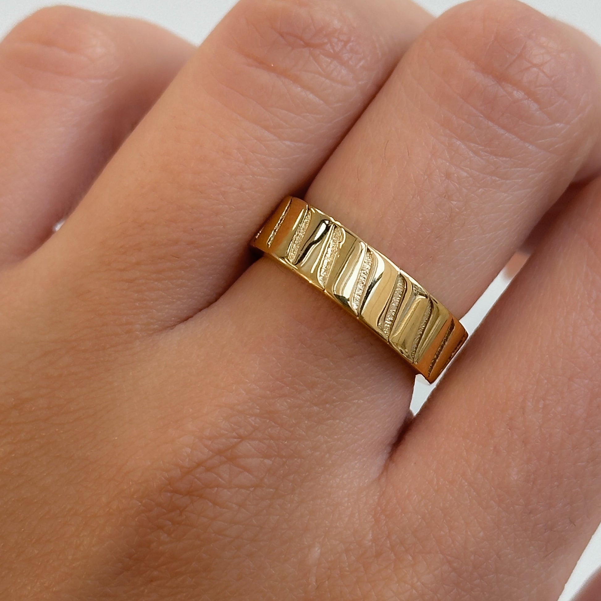 Introducing the Amaia Band Ring, featuring a meticulously carved silhouette and a lustrous sheen that elevates its distinctively bold, striped engraving. This chunky timeless ring is an ideal choice for both daily wear and pairing with other beloved bands.