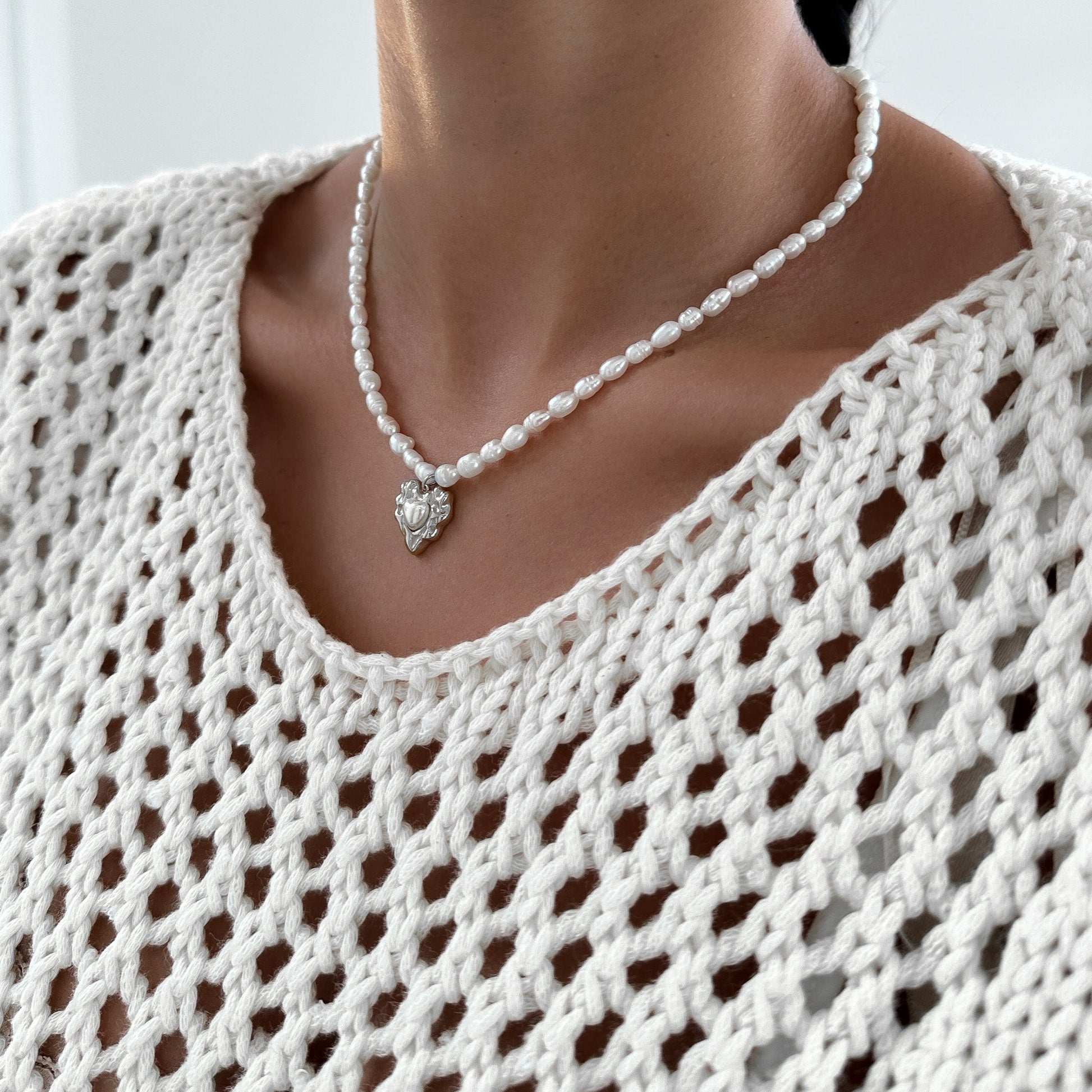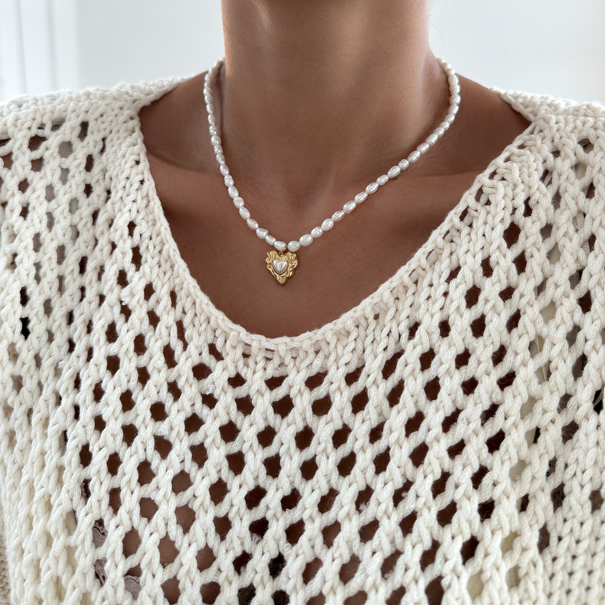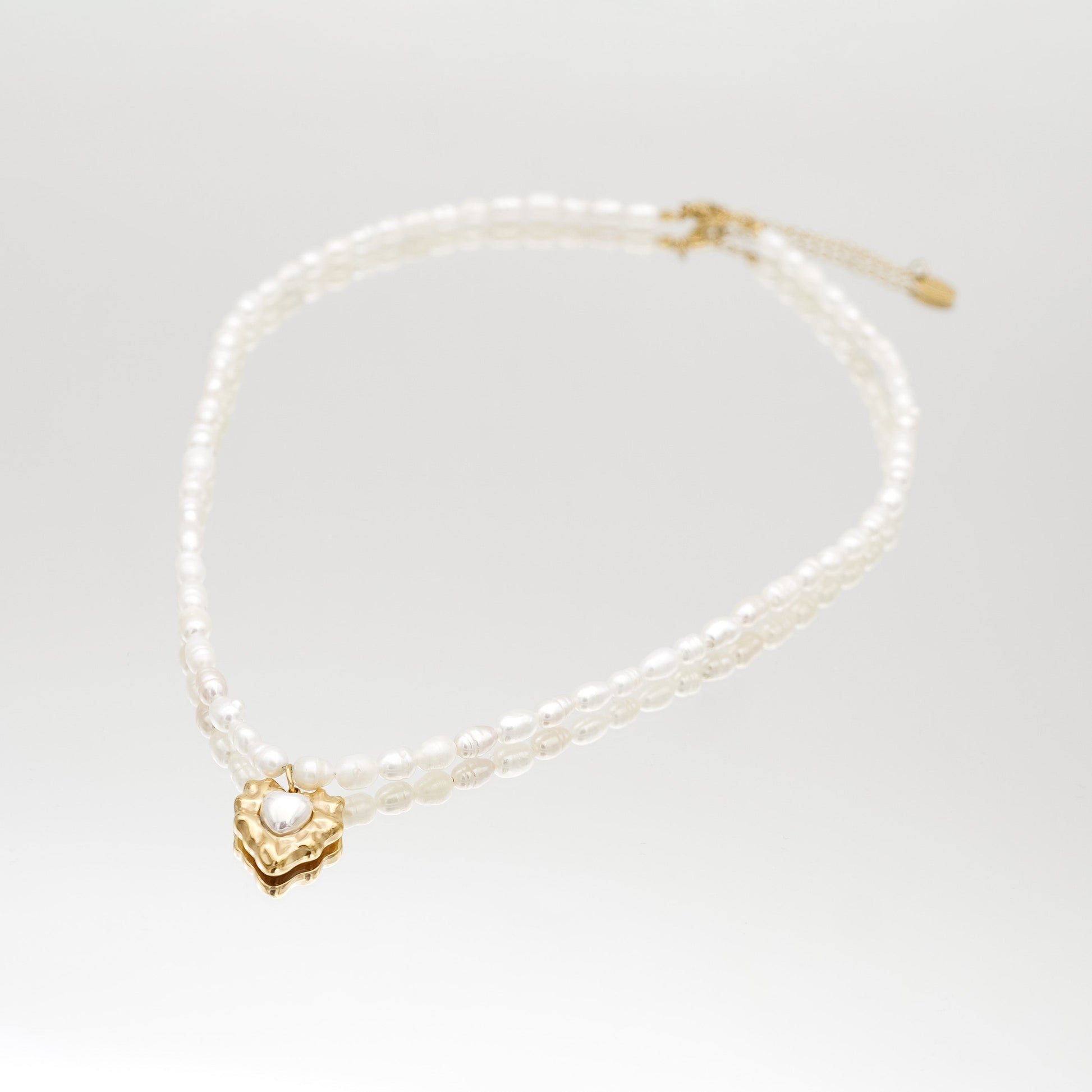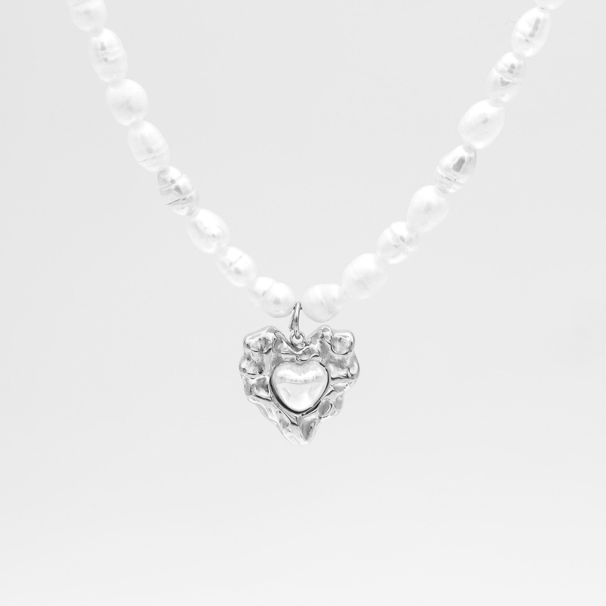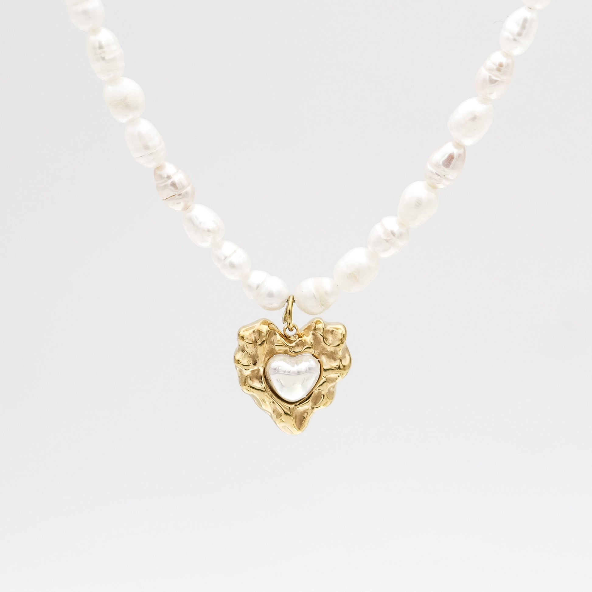Embrace the elegance of the Amber Pearl Heart Pendant Necklace, available in 18k Gold or Silver plated and adorned with freshwater Pearls and melting Heart drop pearl Pendant. Perfect for any occasion, this necklace adds a touch of sophistication and grace to any outfit, making it a cherished addition to your jewellery collection.