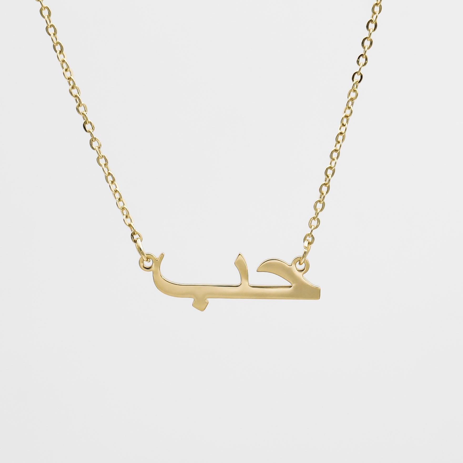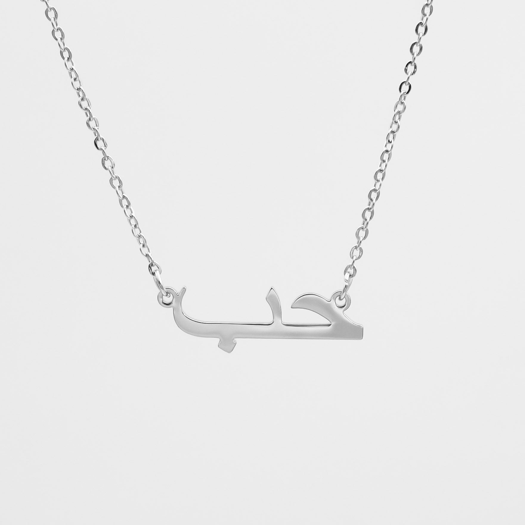 Add Some Middle-Eastern Charm to your look with our Arabic love necklace. Featuring the word "Love" in our beautiful Arabic Script in 18k Gold or Silver Plated Stainless steel, Suspended on our classic chain. Visit our Arabic Collection for more beautiful custom made pieces.