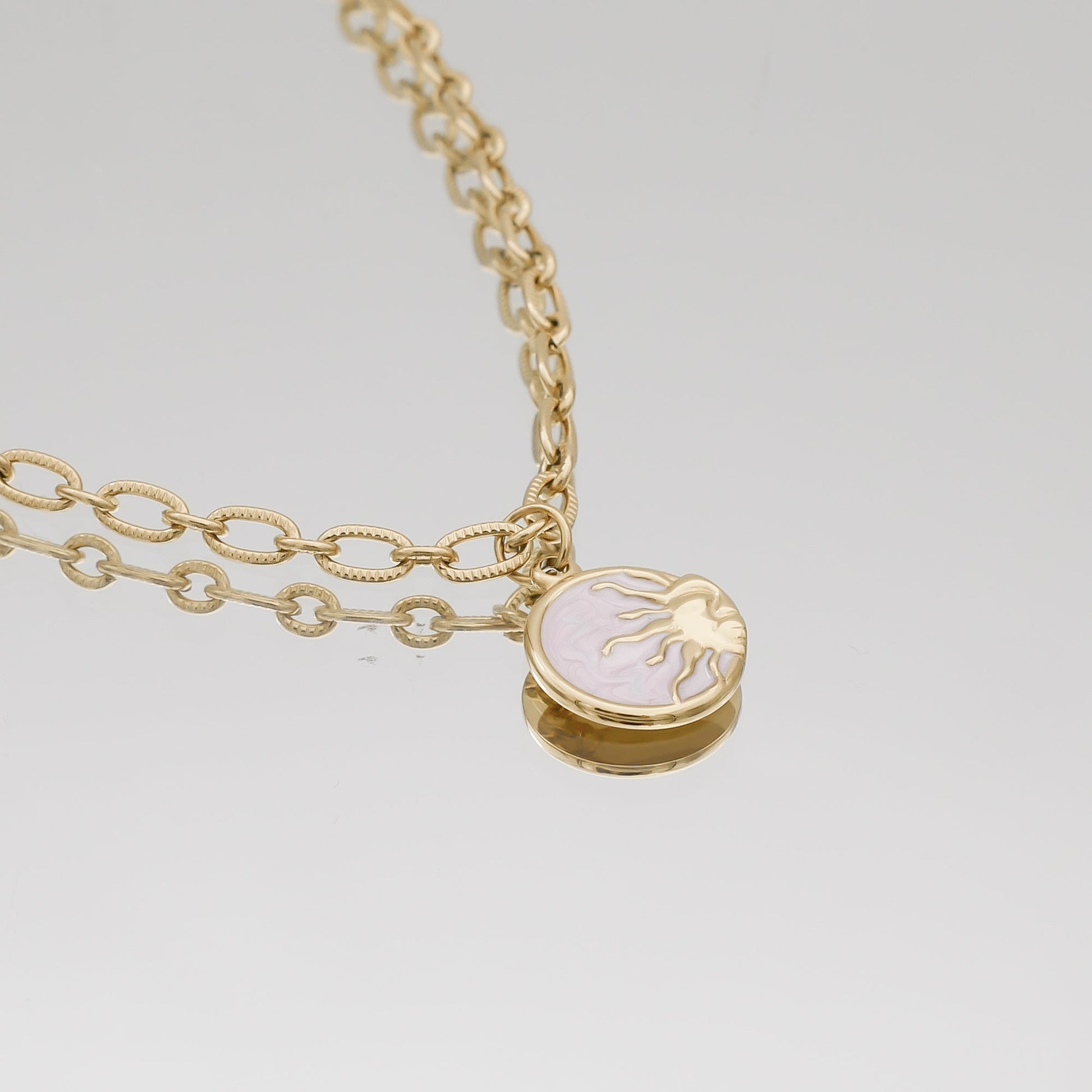 The round pendant is suspended on a stunning hammered paper clip chain that adds texture and movement to the necklace. The metal bail hangs in the centre of the chain and attaches to the pendant with a small loop at the top of the pendant. The round-shaped pendant is bordered with polished detailing. The beautiful sun detailing is set as the star of the show. The necklace is fastened with a classic trigger clasp, making it super easy and comfortable to wear. Layer with your favourite choker or wear it alone as a statement piece.