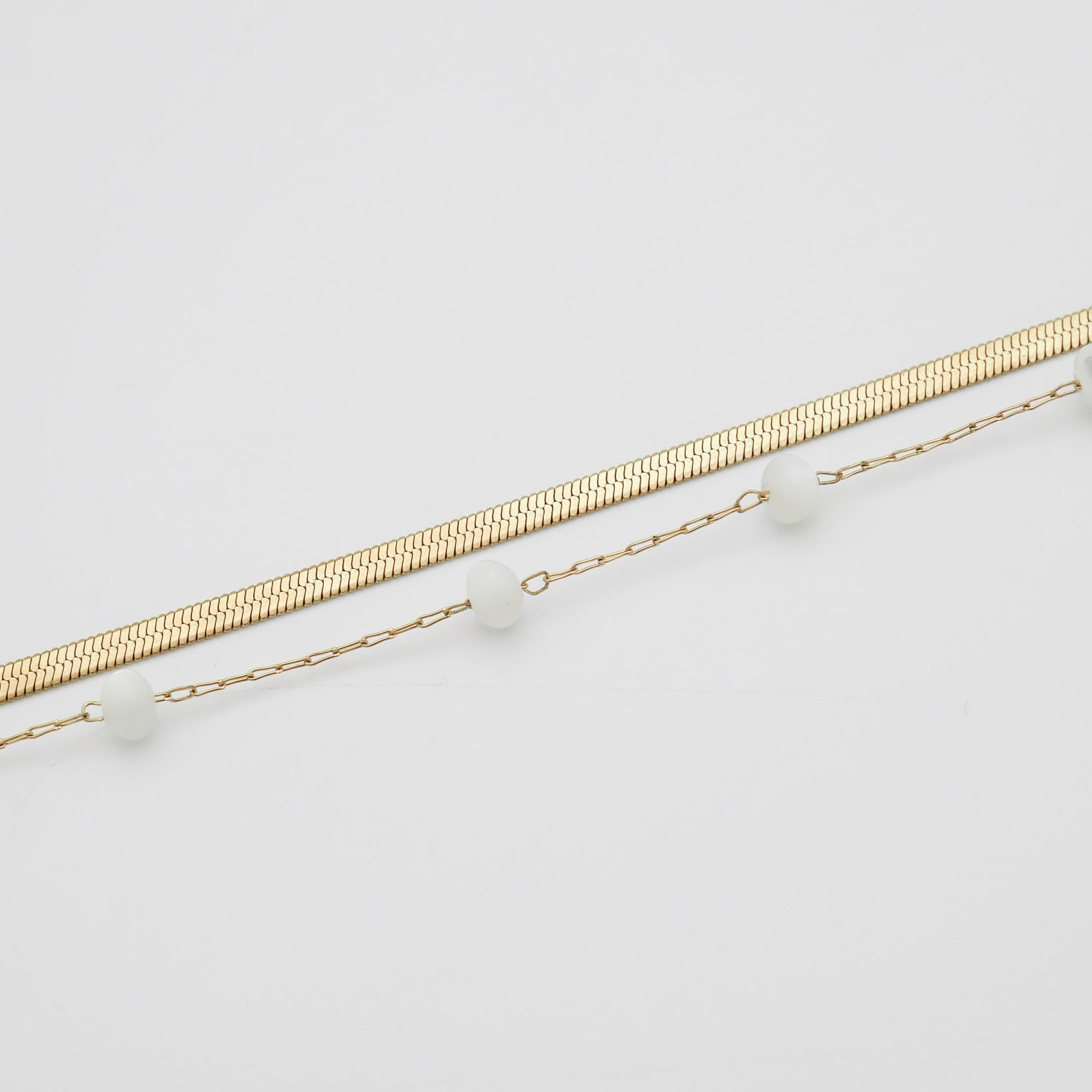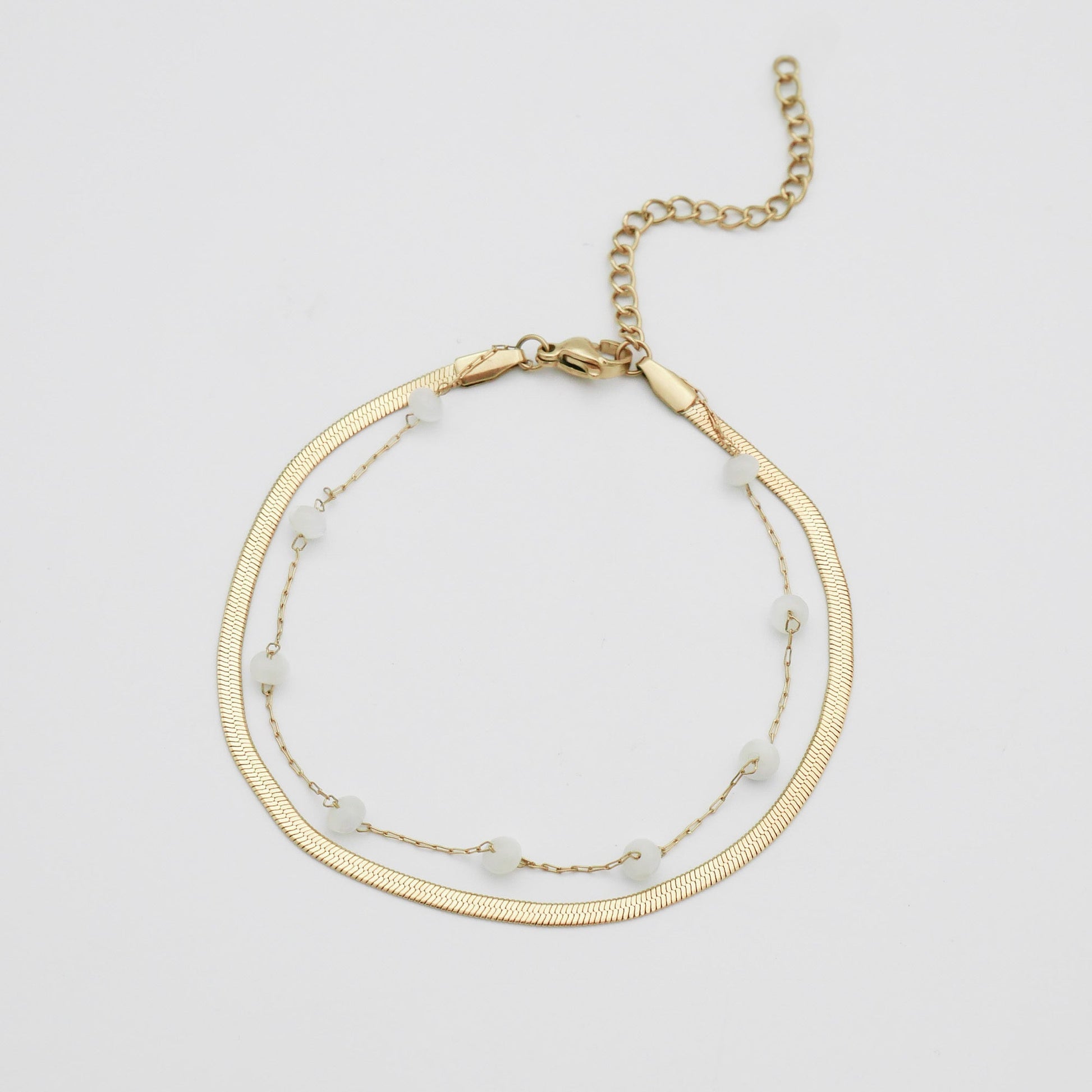 The Bella Layered Anklet is the perfect anklet to elevate any look. Its layered design includes a herringbone chain and a classic chain adorned with pearls for a classic touch. Its delicate design is sure to become a timeless favourite.
