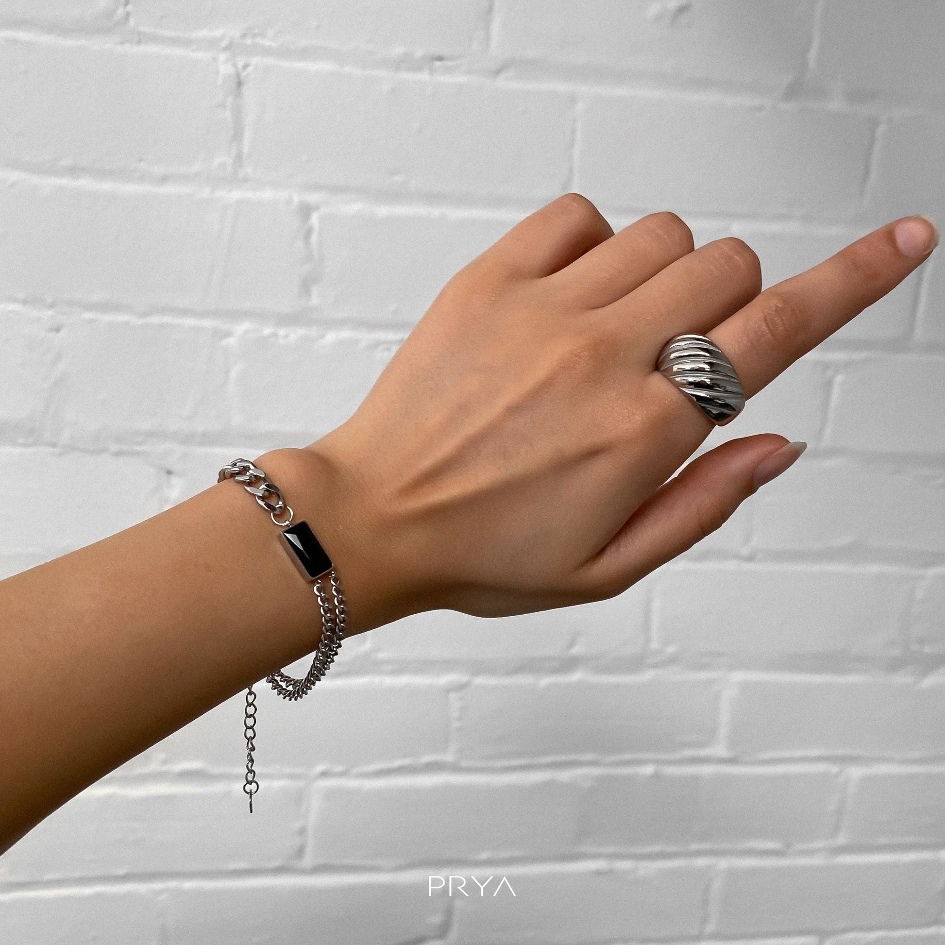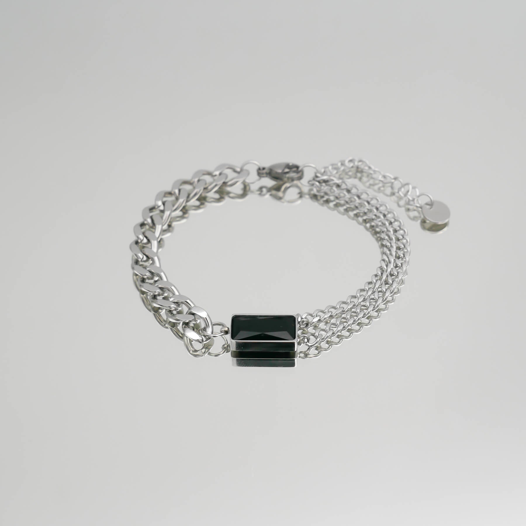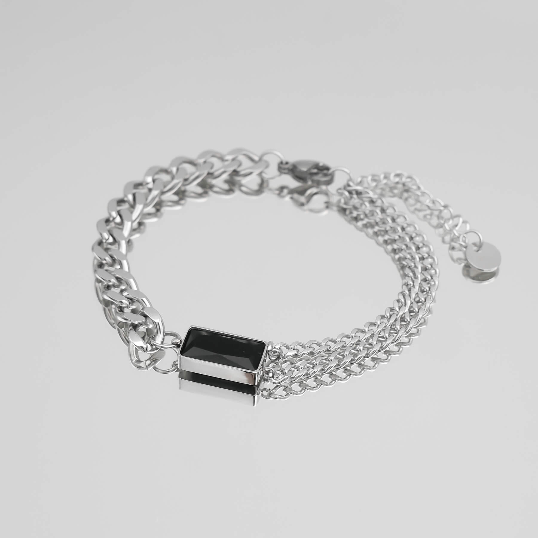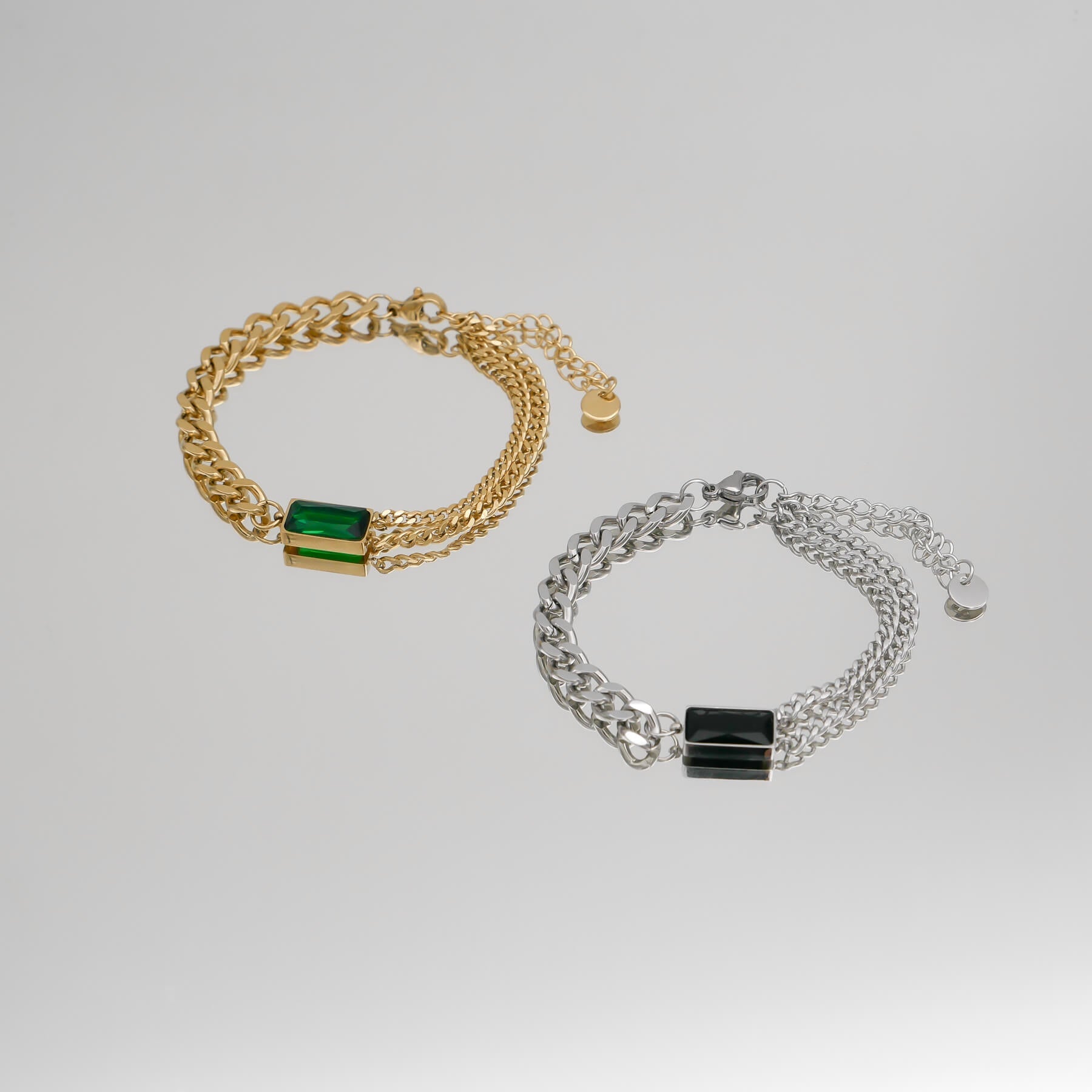 This Callie bracelet is an effortless design that balances minimalism and statement dressing. Featuring a captivating emerald stone suspended between contrasting cuban chain designs. One side of the bracelet features two separated cuban chains and on the other side, a thick cuban link chain. This distinctive gem works perfectly as a solo statement piece or stack with a couple of other bracelets. Match with our Callie necklace for a captivating look that no one can resist admiring.