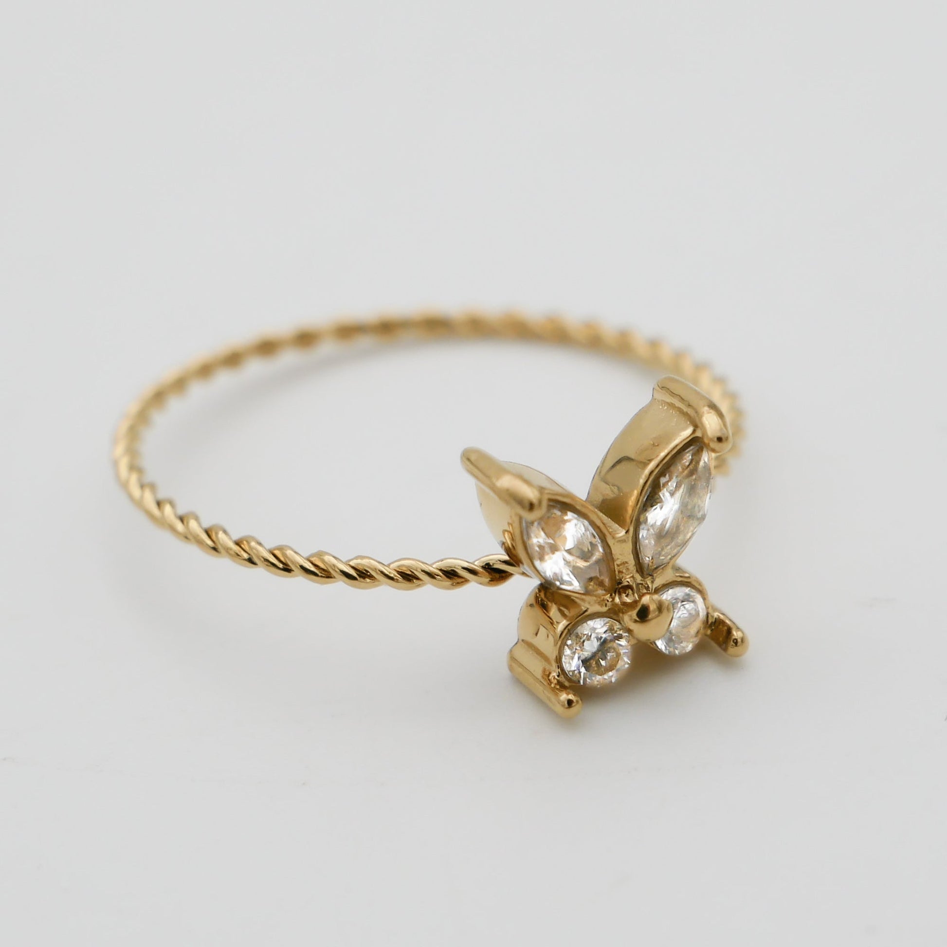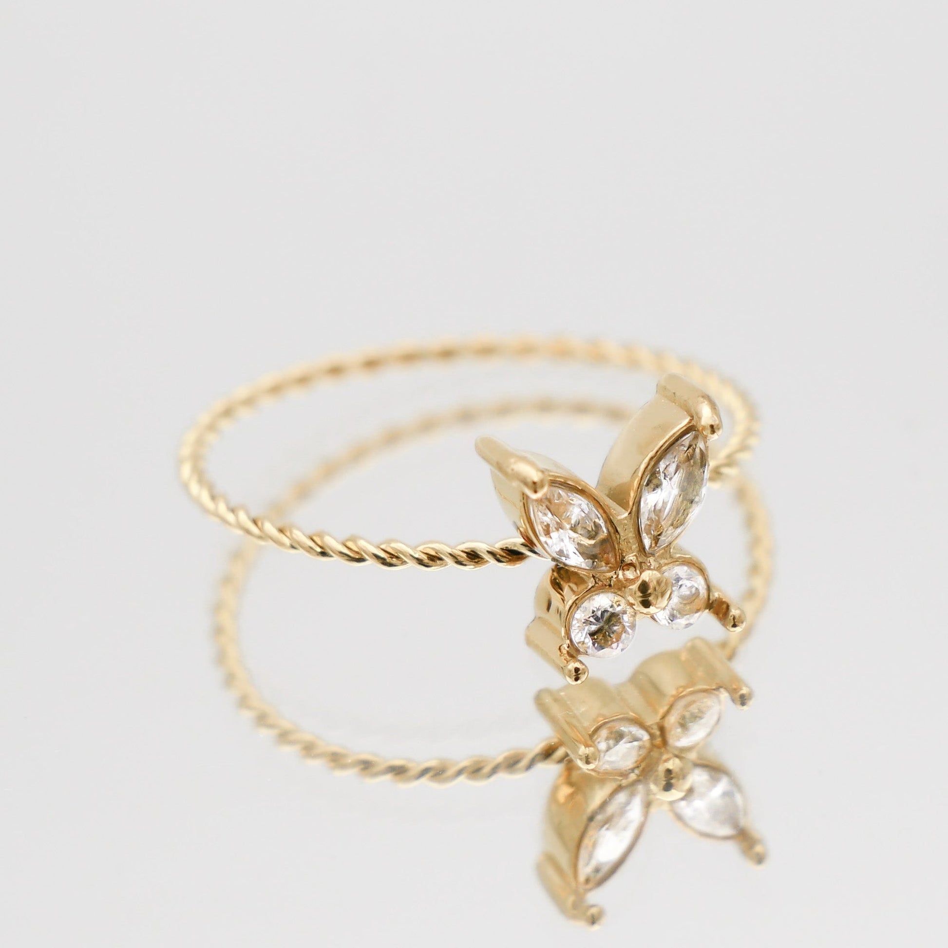 Our exquisite Caria Butterfly Ring showcases a sparkling cubic zirconia butterfly centrepiece, symbolising transformation and new beginnings. The intricate twisted band adds to its allure, while the high-quality cubic zirconia crystals bring extra shimmer. Perfect for dressing up casual outfits or complementing formal attire, this elegant gold ring is designed to turn heads. Treat yourself or gift a loved one with this beautiful statement piece!