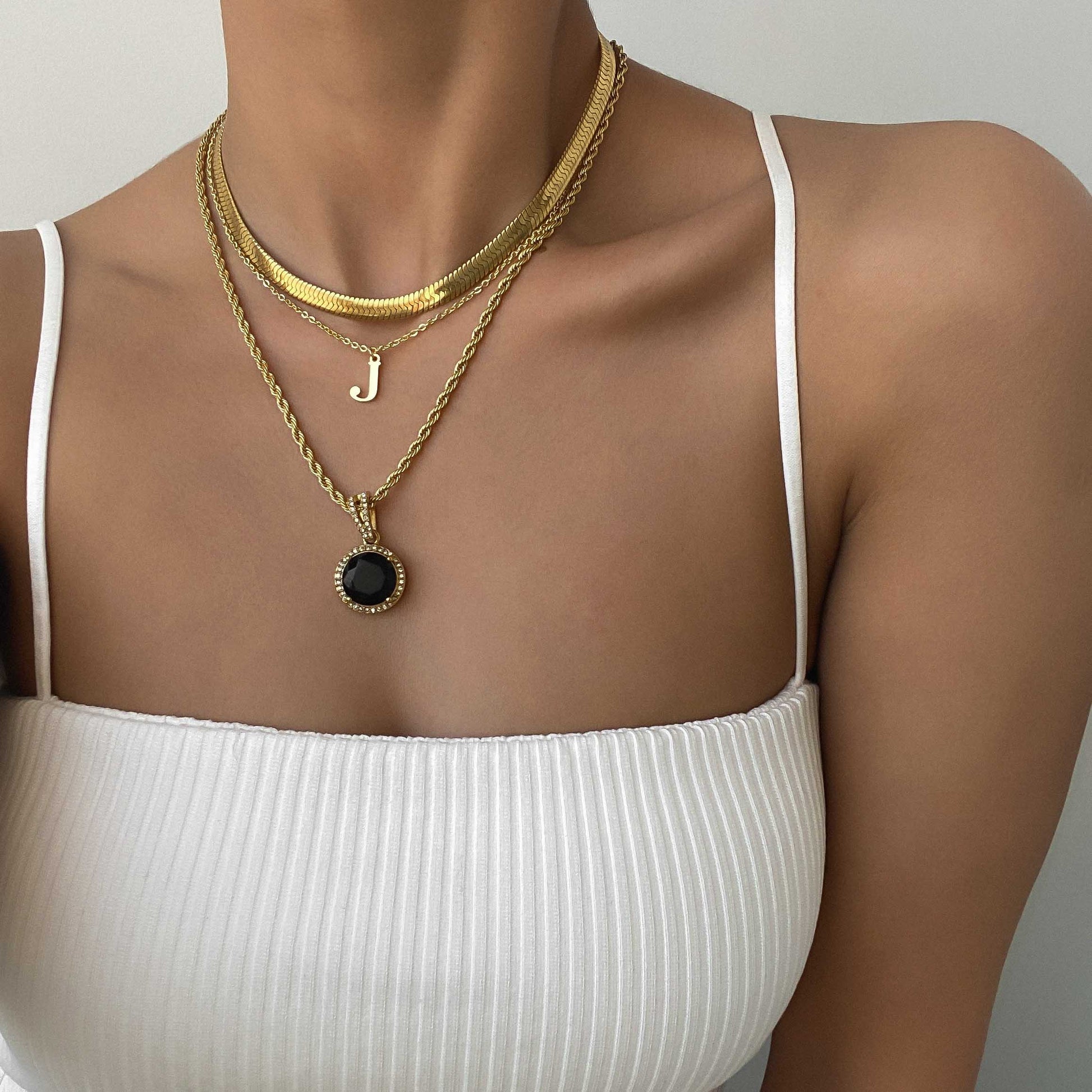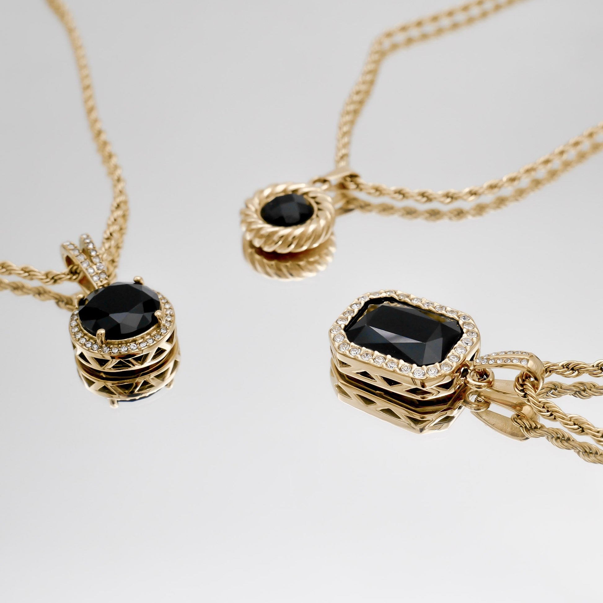 Our Clarissa Onyx Necklace is a vintage-inspired gemstone piece that features a rounded black emerald cut stone, surrounded by gems and supported by a gorgeous rope chain. This piece is modern, beautifully crafted and exudes elegance.
