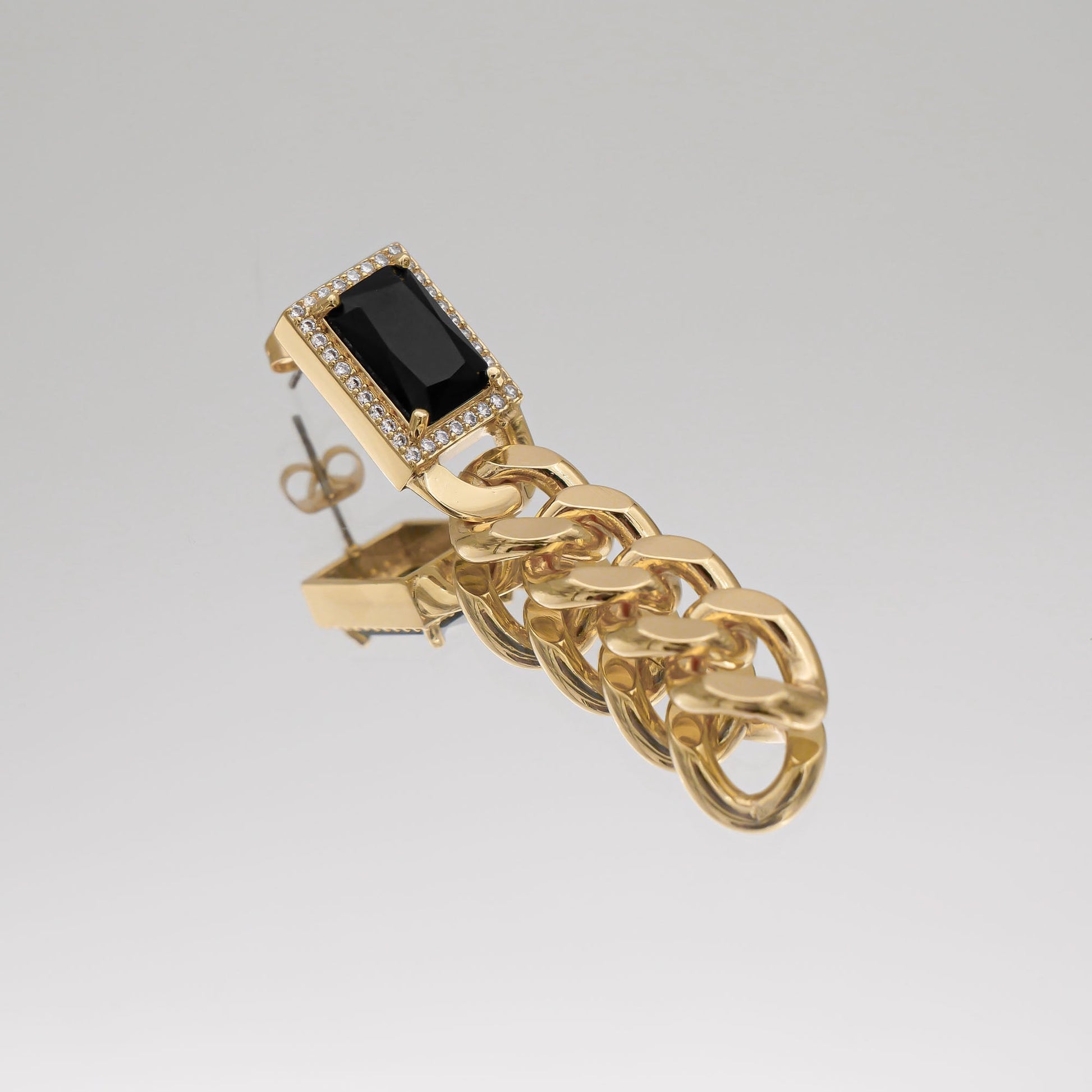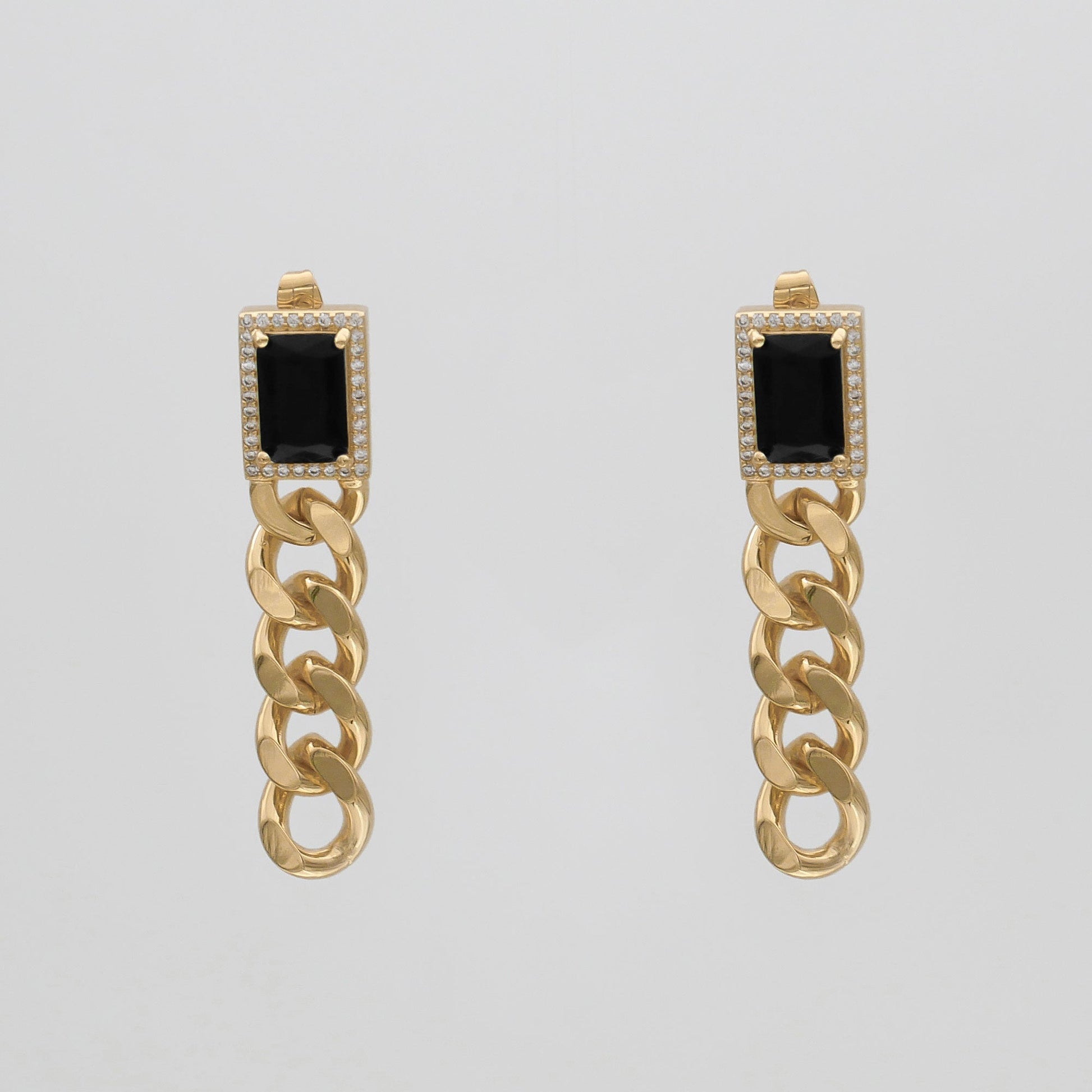 Our Diana Onyx Tablet Chain earrings are a vintage-inspired gemstone piece that features a black emerald cut stone, surrounded by gems and secured and supported by a cuban chain style drop earring. This piece is modern, beautifully crafted and exudes elegance.