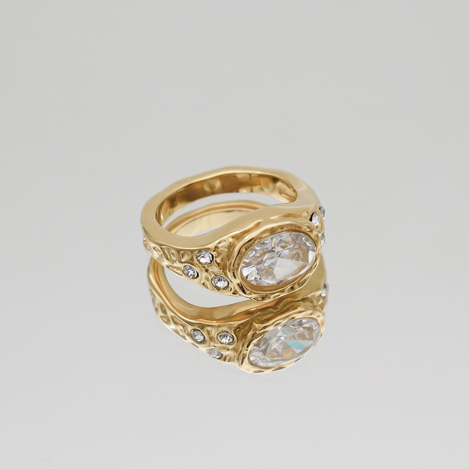 Each ring is delicately bezel set into a detailed encrusted 18k gold plated frame with our high grade imitation Cubic Zirconia for that extra durable feel. Let it shine beautifully on its own, or mix and match with our other statement rings.