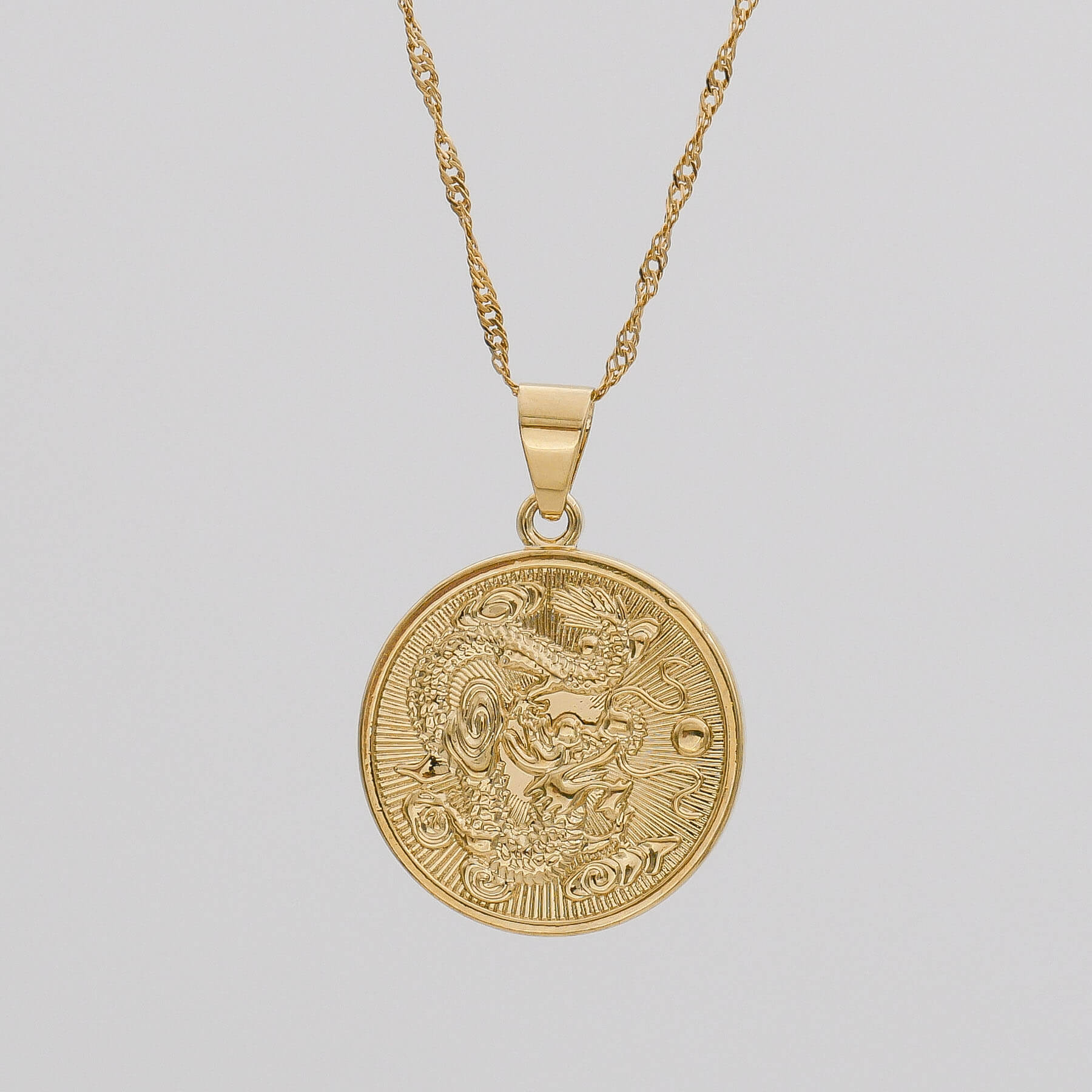Our stunning 18k gold plated dragon coin necklace is the perfect staple and is easily versatile. Whether you're going out or opting for a casual look, this coin necklace will add to any ensemble.