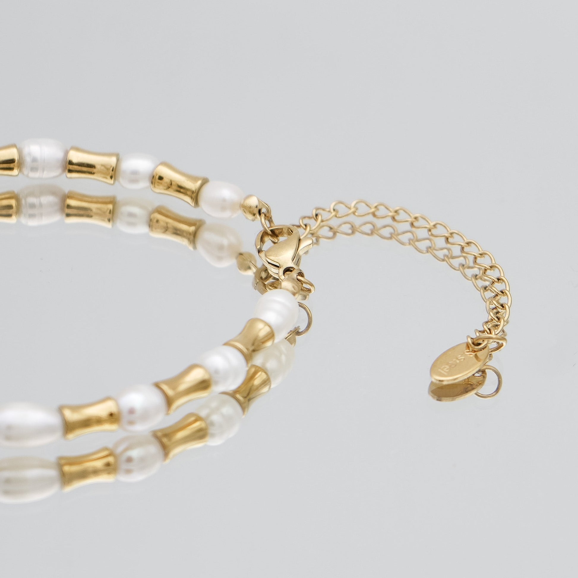 The Eden Pearl Bead Bracelet, features delicate gold plated bamboo shaped beads and lustrous pearls. This stunning bracelet adds a timeless touch to any outfit. Its versatile design makes it ideal for both casual and formal occasions, effortlessly elevating your look. Whether worn alone or paired with its matching bracelet here.