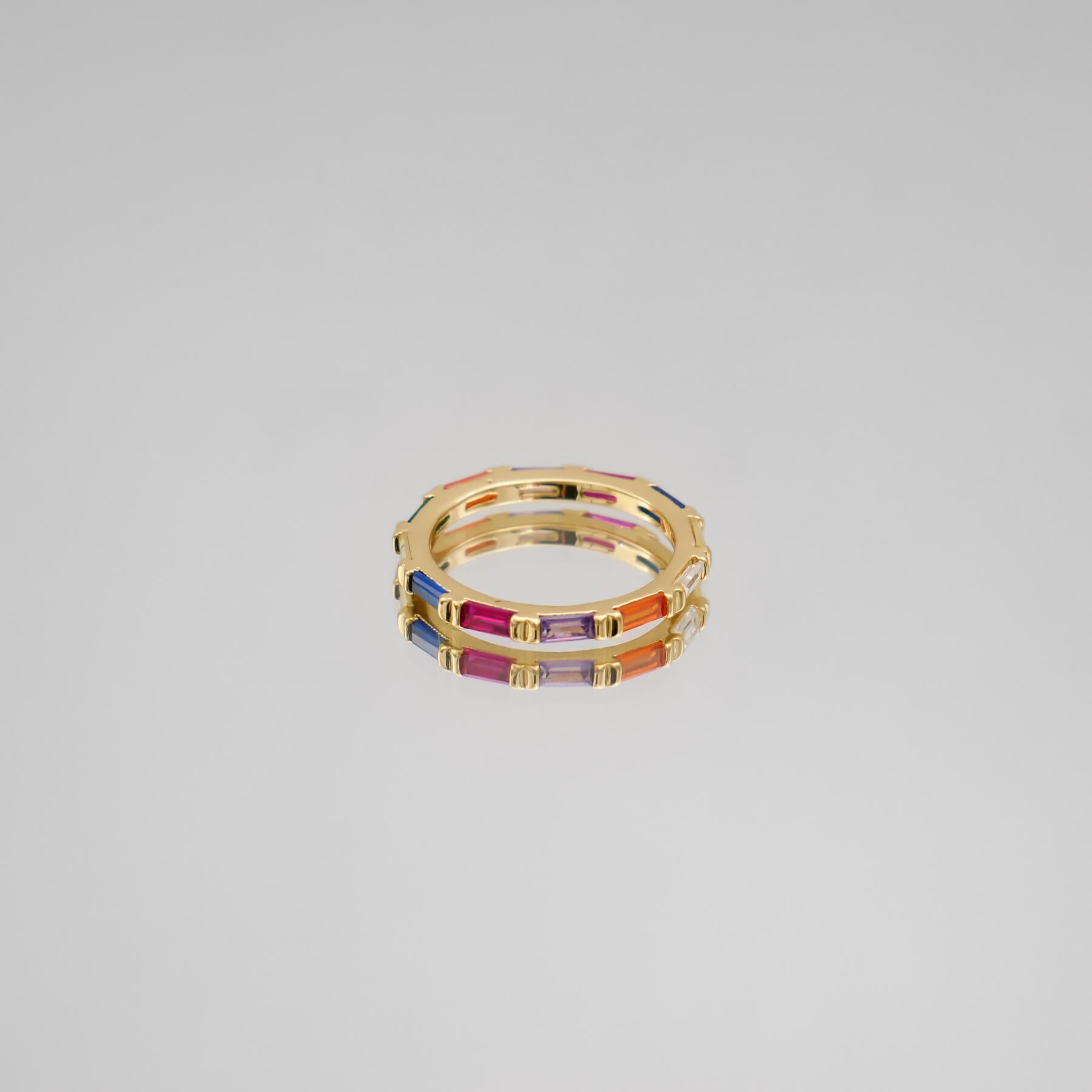 An exquisite stylish piece, our Elsie rainbow ring is beautifully handcrafted and exudes elegance. The combination of the minimalistic structure and colourful paved set stones, creates a modern contrast. This golden, colourful ring gives every look that extra touch. Stack with our Shona and Tess rainbow rings or let it shine on its own.