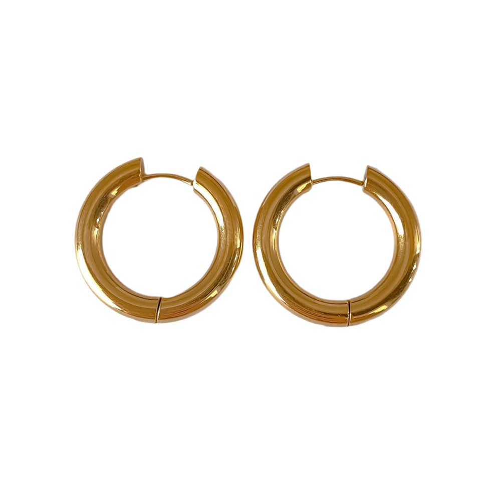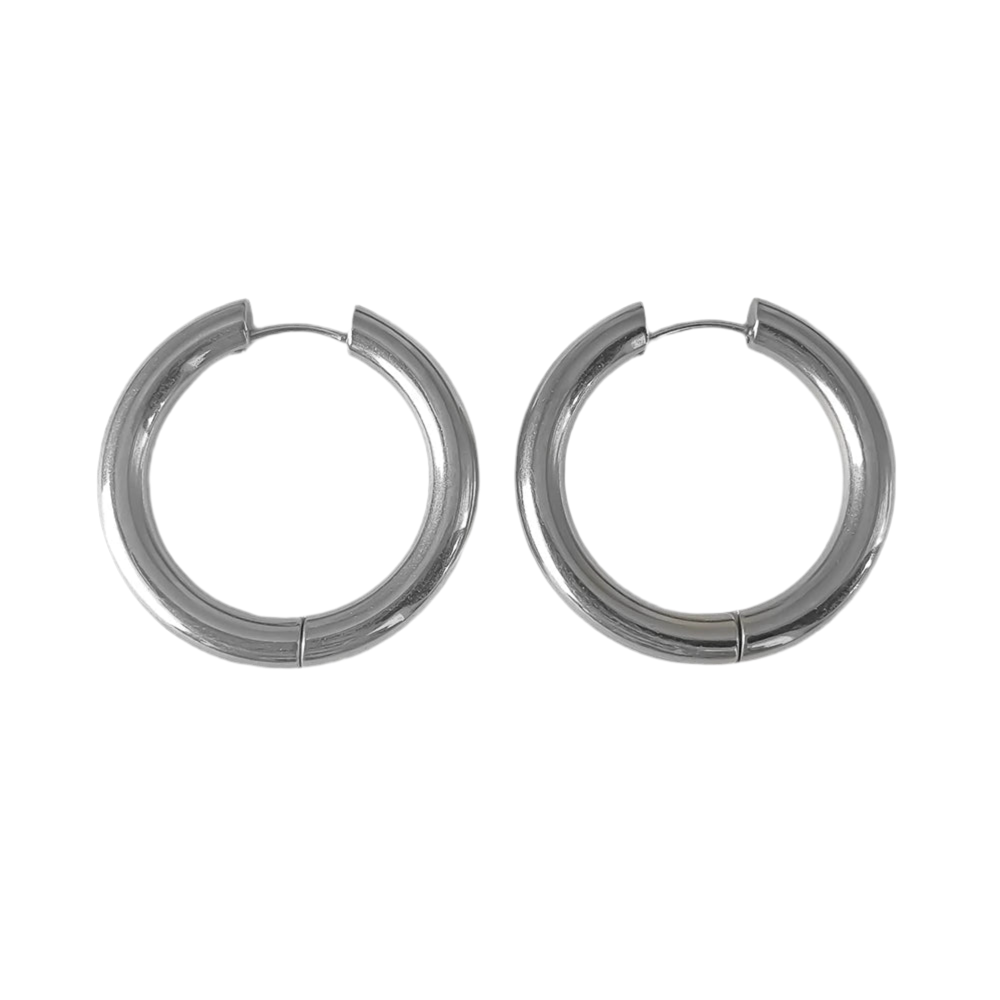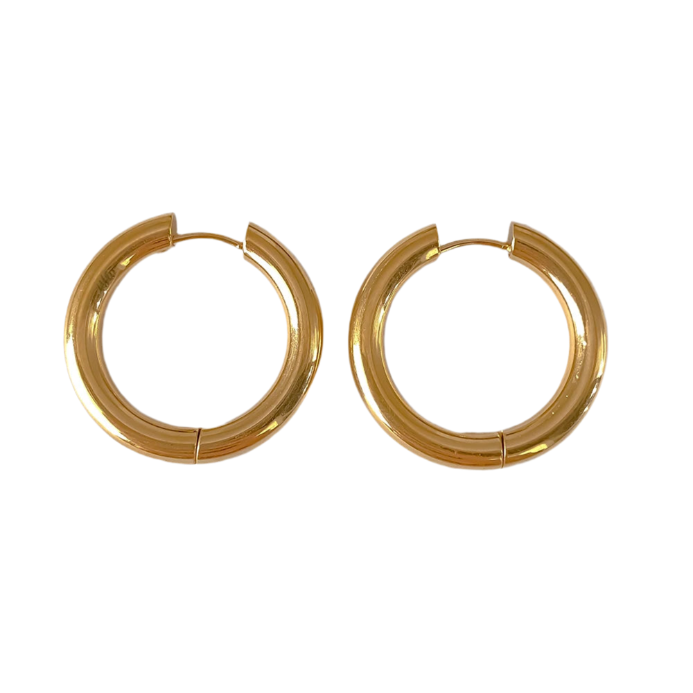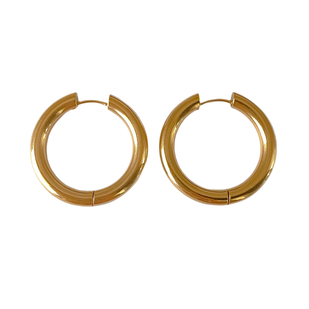 Discover the timeless sophistication of stainless steel hoop earrings, with a luxurious gold or silver finish. With an impactful and elegant design, these pieces combine boldness and class, perfect for those who want to stand out with style. Ideal to elevate everyday productions or compose party looks with personality. Resistant to water and time, they keep their impeccable shine for much longer. A modern touch with classic essence — indispensable in your collection.