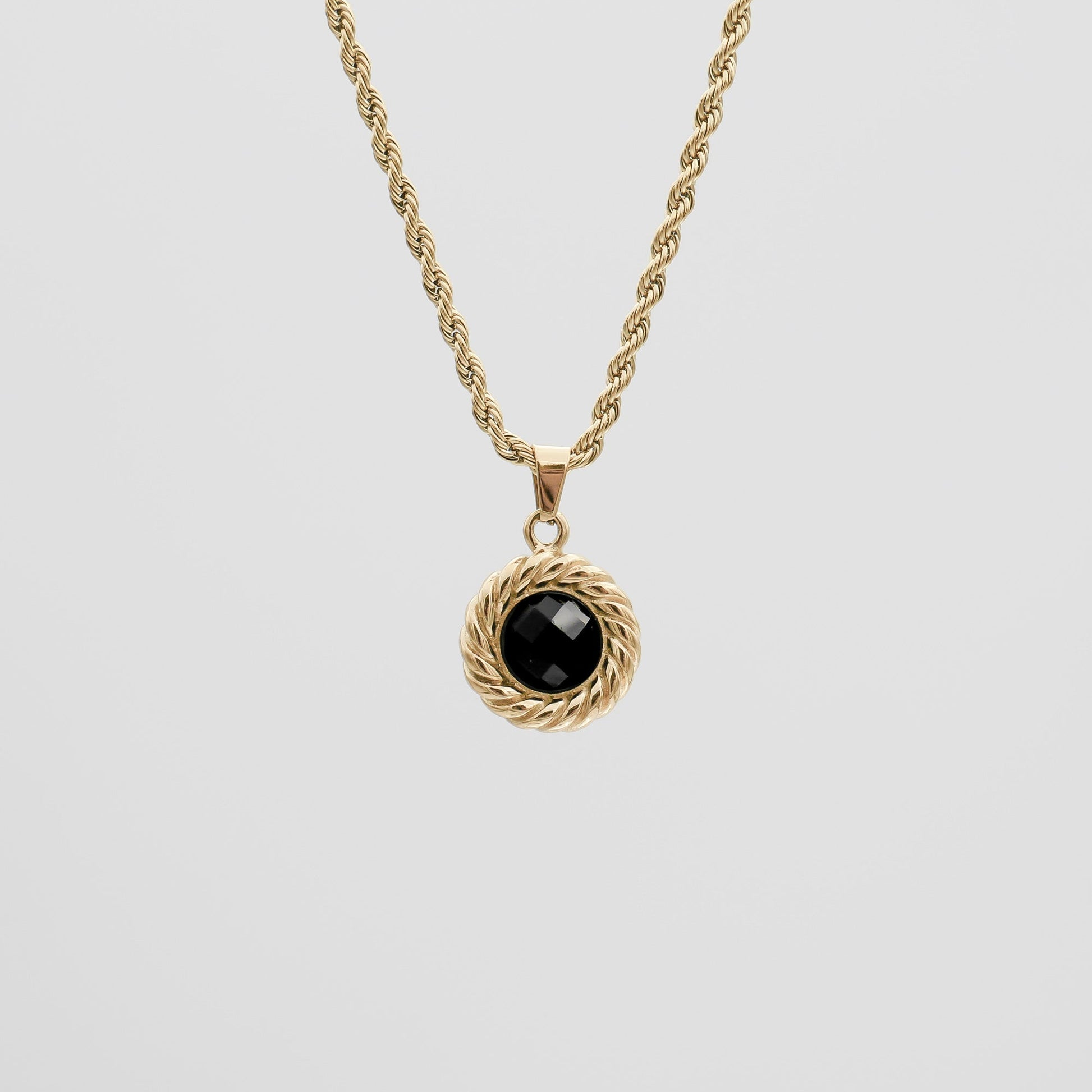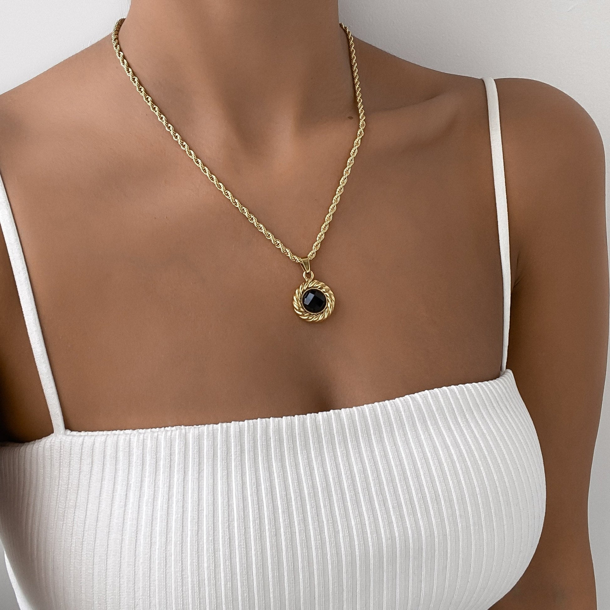 Our Esme Onyx Necklace is a vintage-inspired gemstone piece that features a rounded black emerald cut stone, surrounded by a gorgeous rounded plait and supported by a delicate rope chain. This piece is modern, beautifully crafted and exudes elegance. Also available in Pearl