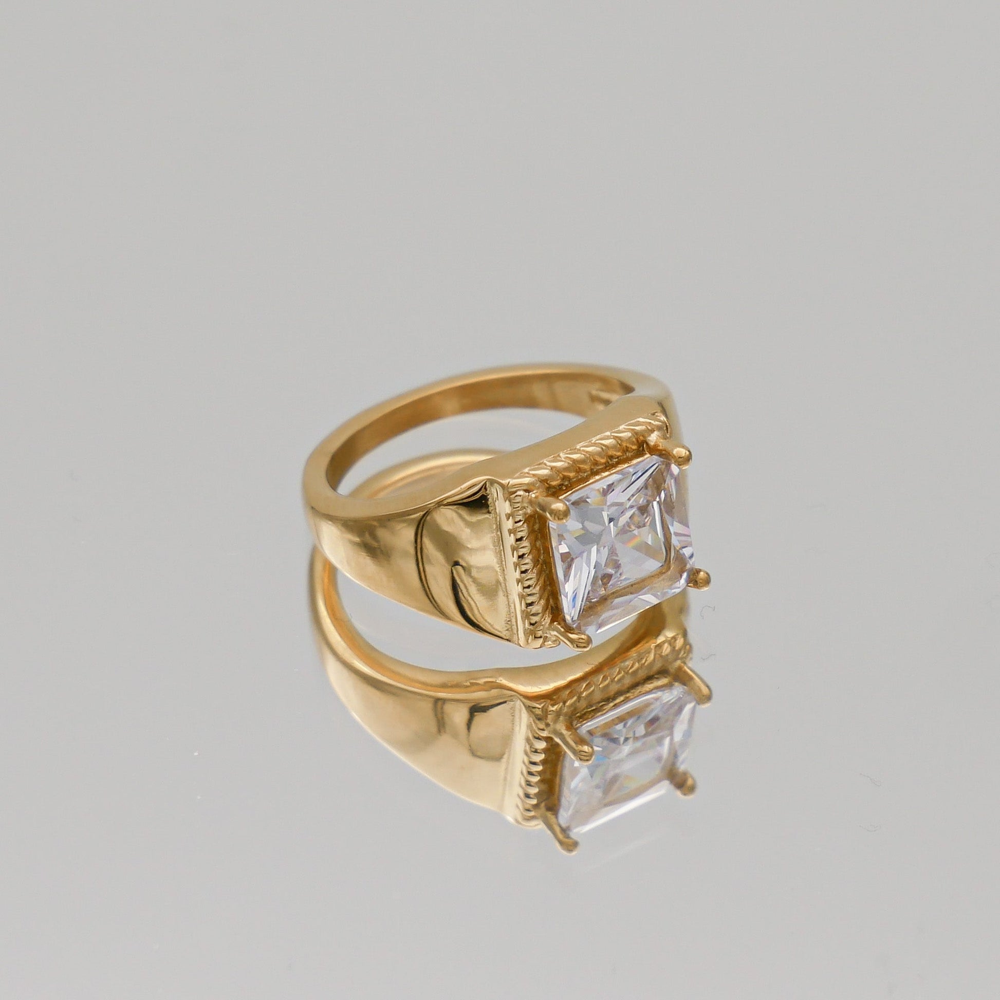 Our beautiful Hana Gemstone Signet Ring is a unique take on the classic signet ring design. The band is made of 18K gold plated stainless steel in the classic signet ring band shape, sizing from a thin band at the back, growing into a chunkier band to hold the signet. The frontage has a facing that allows for a square set gem. The basket setting has an elegant, twisted design that follows around the perimeter with four small columns pointing out from the corners to secure the gem in place.