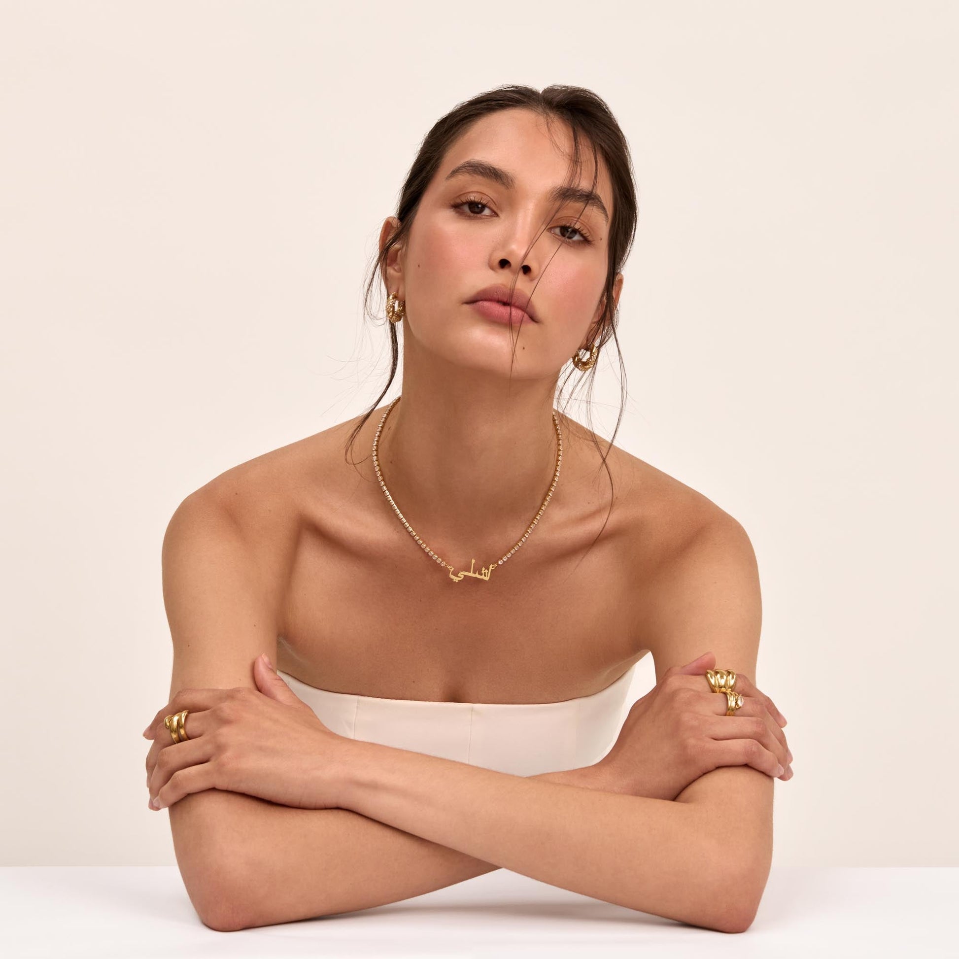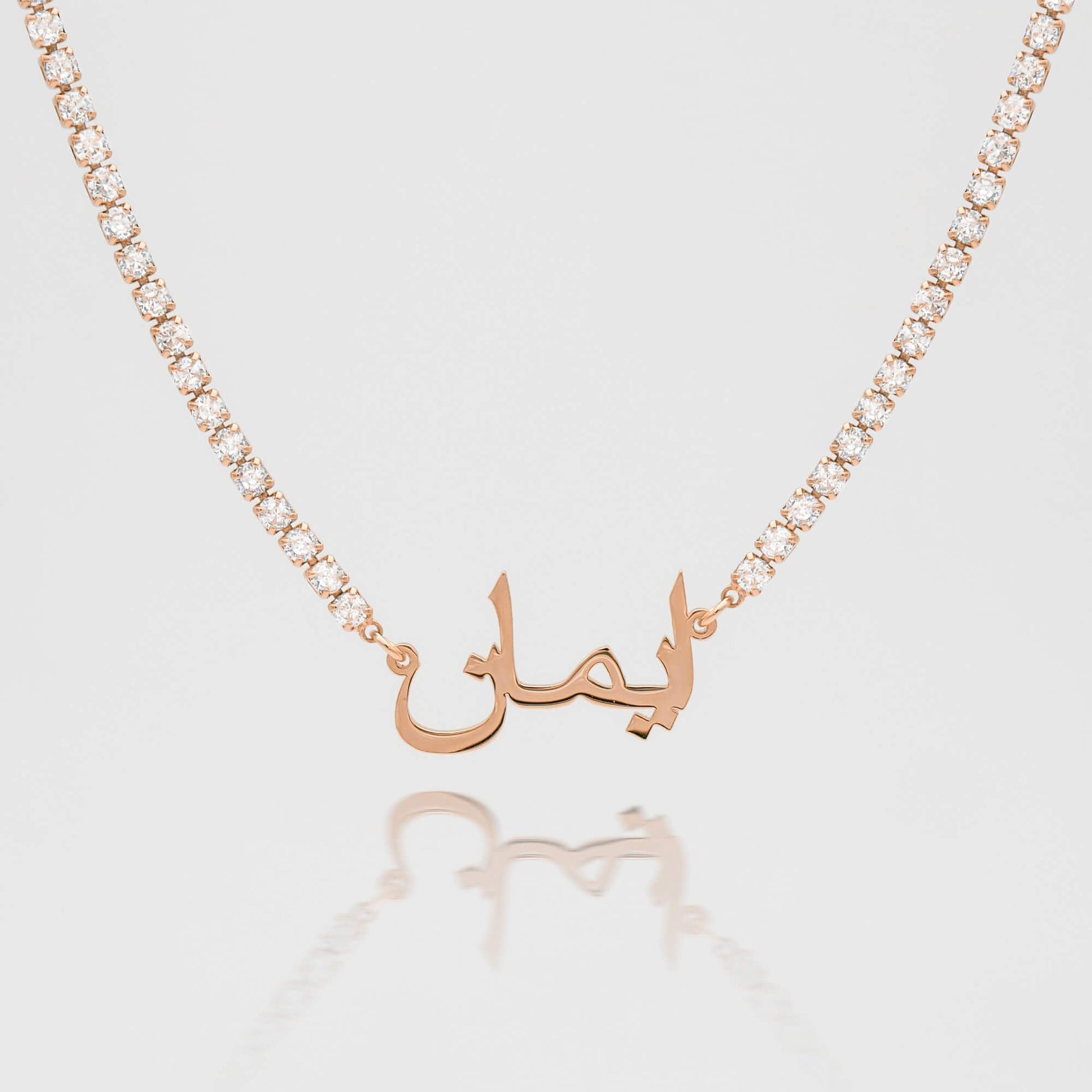Add a touch of Arabic charm to your style this season with our luxurious ICY Arabic Name Necklace. Inspired by the stunning script style of Arabic calligraphy, this necklace is a beautifully designed piece suspended on a sleek tennis chain, the Pave Arabic is a twist on our most-loved original Arabic name necklace.