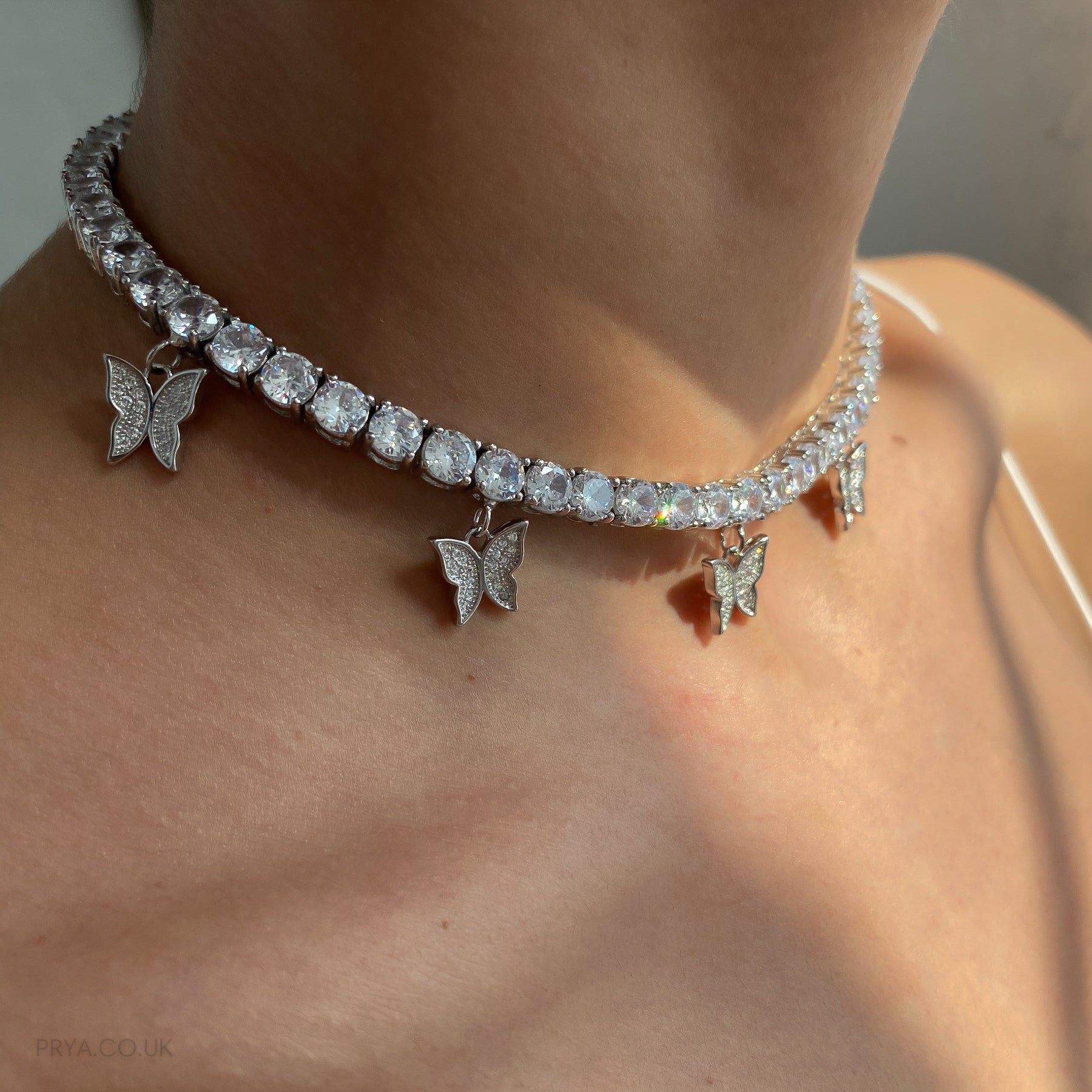 Our Butterfly CZ Choker is a beautiful statement piece. Crafted from 18k gold or silver filled stainless steel, it features the highest grade hand set Cubic Zirconia stones to keep it shining from all angles.