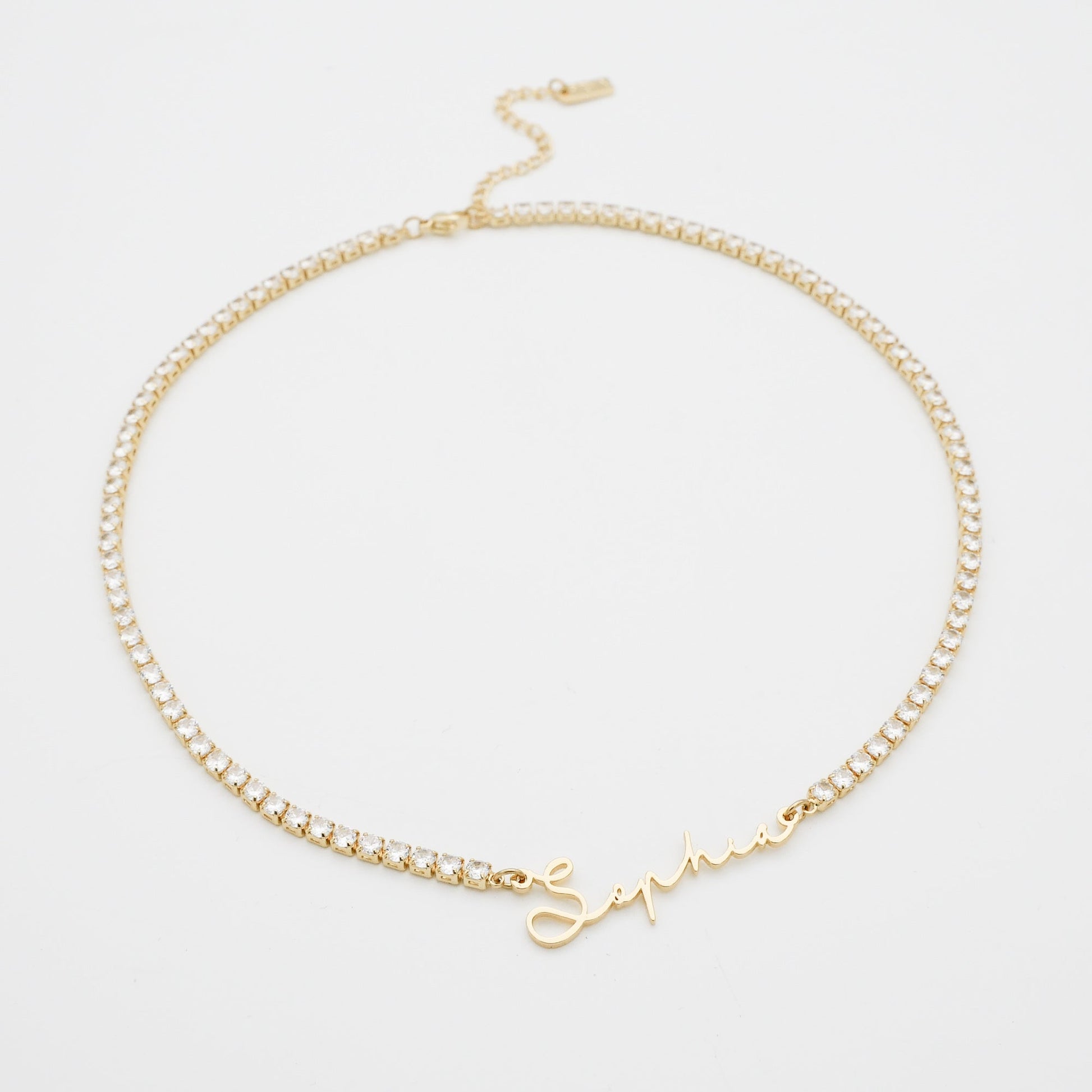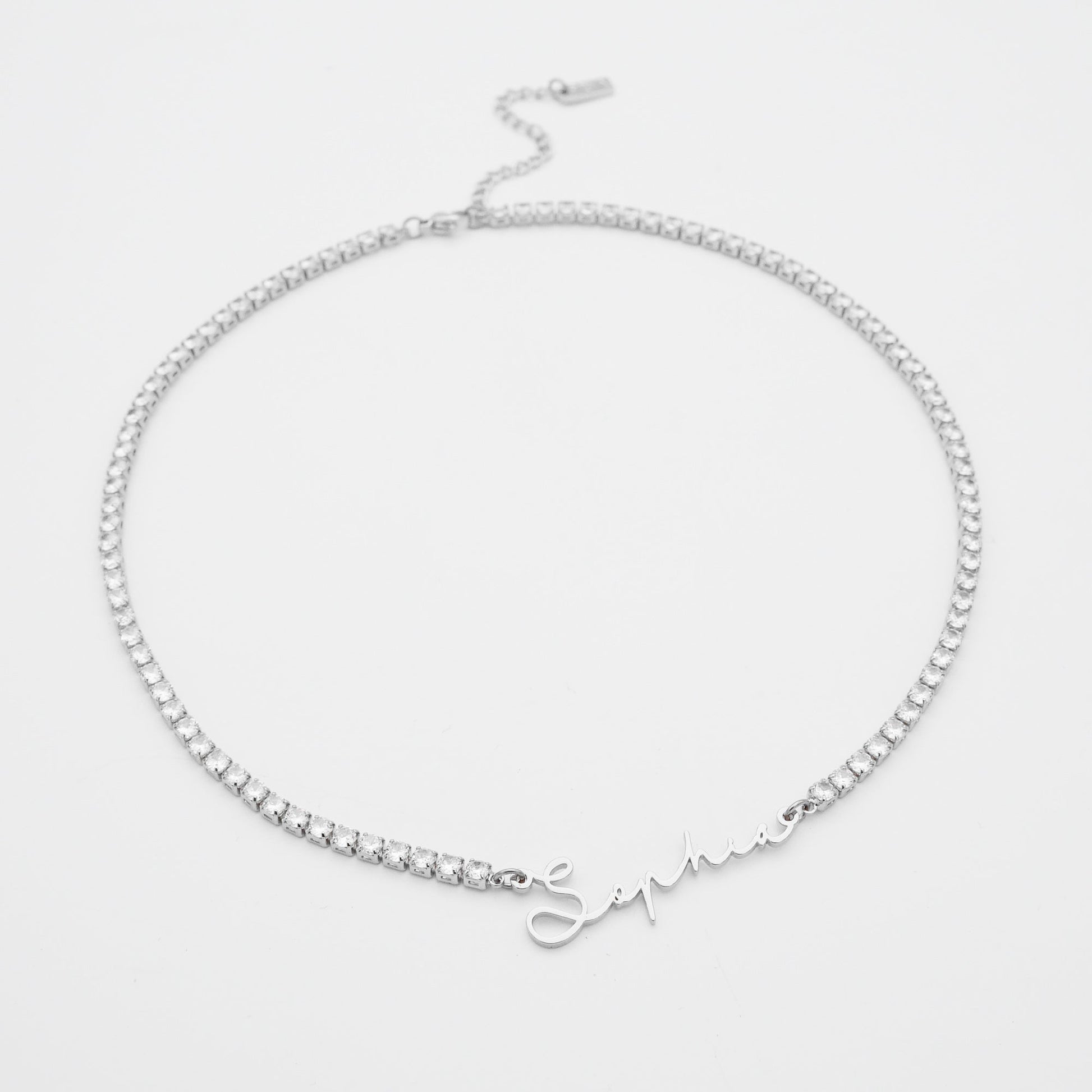 Suspended on a sparkling pave tennis chain, this name necklace blends luxury and personalisation in one radiant piece. Crafted with care, it’s tarnish-resistant and made to shine all year long – from sunny days to evening events.