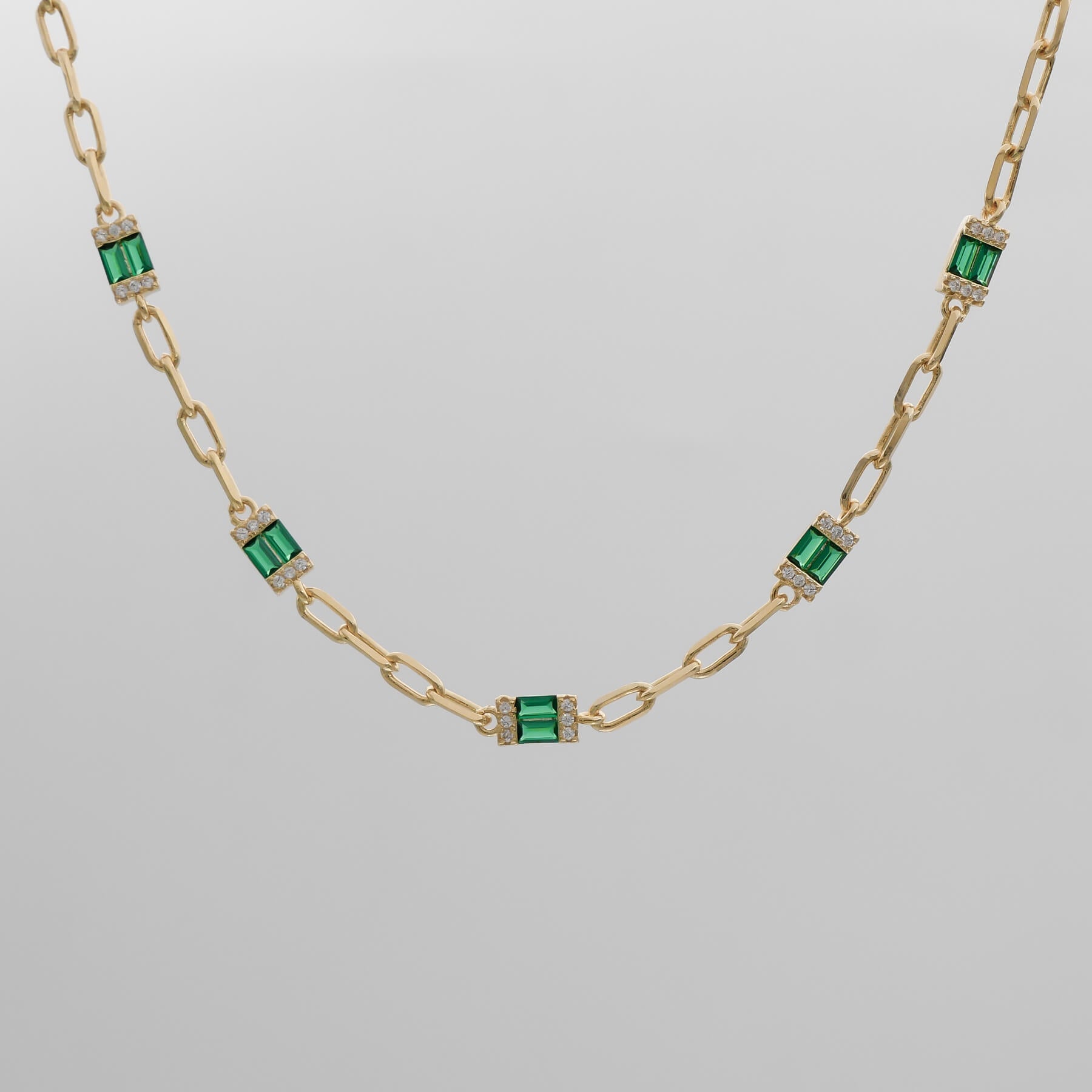 An exquisite and elegant piece, our Jenna emerald necklace features 7 beautifully crafted emerald stones suspended onto a delicate paperclip link chain. Each stone is surrounded by paved set clear CZ stones, creating a stunning combination. This gorgeous necklace will glisten on its own or pair with some of our emerald bracelets and rings for a mesmerising look.