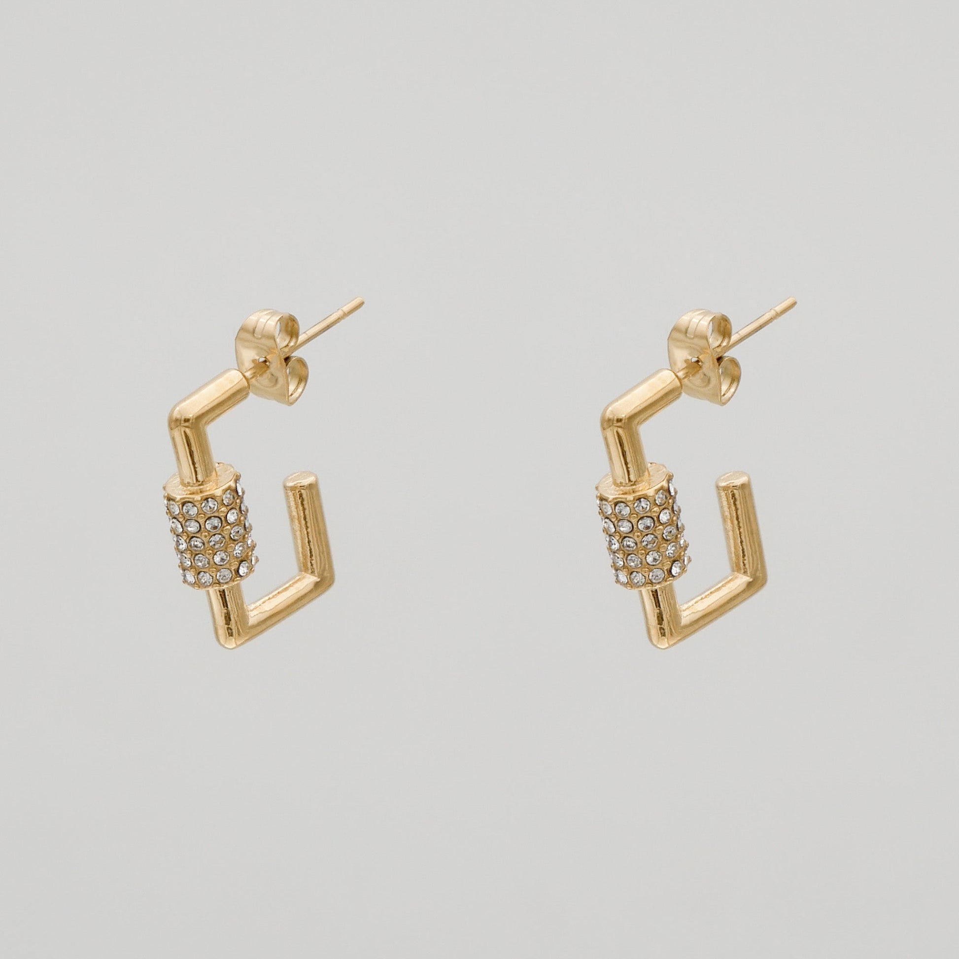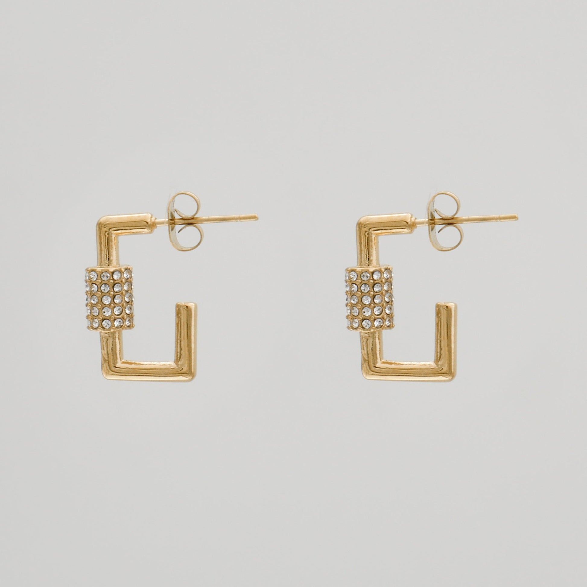 Our Kenza Earrings are square-shaped half hoop earrings with a gorgeous, cubic zirconia barrel feature. The earrings are made from 18K gold plated stainless steel. The loop is crafted from a thin, tube that is shaped into the squared half hoop shape. While it does represent a square, the edges are smoothed into a curve rather than a cutting right angle. The lightweight hoop and small size, make them an ideal option for work or everyday wear. At the front of the loop is a further decorative tube. This gold cylinder sits in the middle of the front-facing edge and is encrusted with many round, tiny cubic zirconia gems. It adds a real shine to this simple accessory. The earring is secured with a simple pin and butterfly backing.