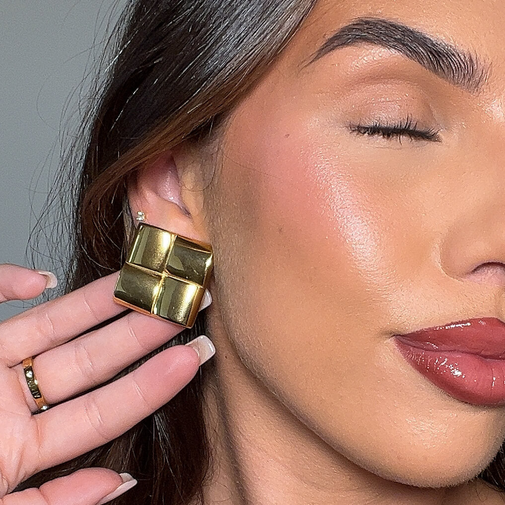 The Kia Earrings feature an embossed geometric square design, combining modern sophistication with timeless elegance. Crafted in 18k Gold or Silver plated stainless steel, these earrings offer a bold, structured look that makes a striking statement. Perfect for both day and night, their unique geometric pattern adds a touch of contemporary style to any outfit.