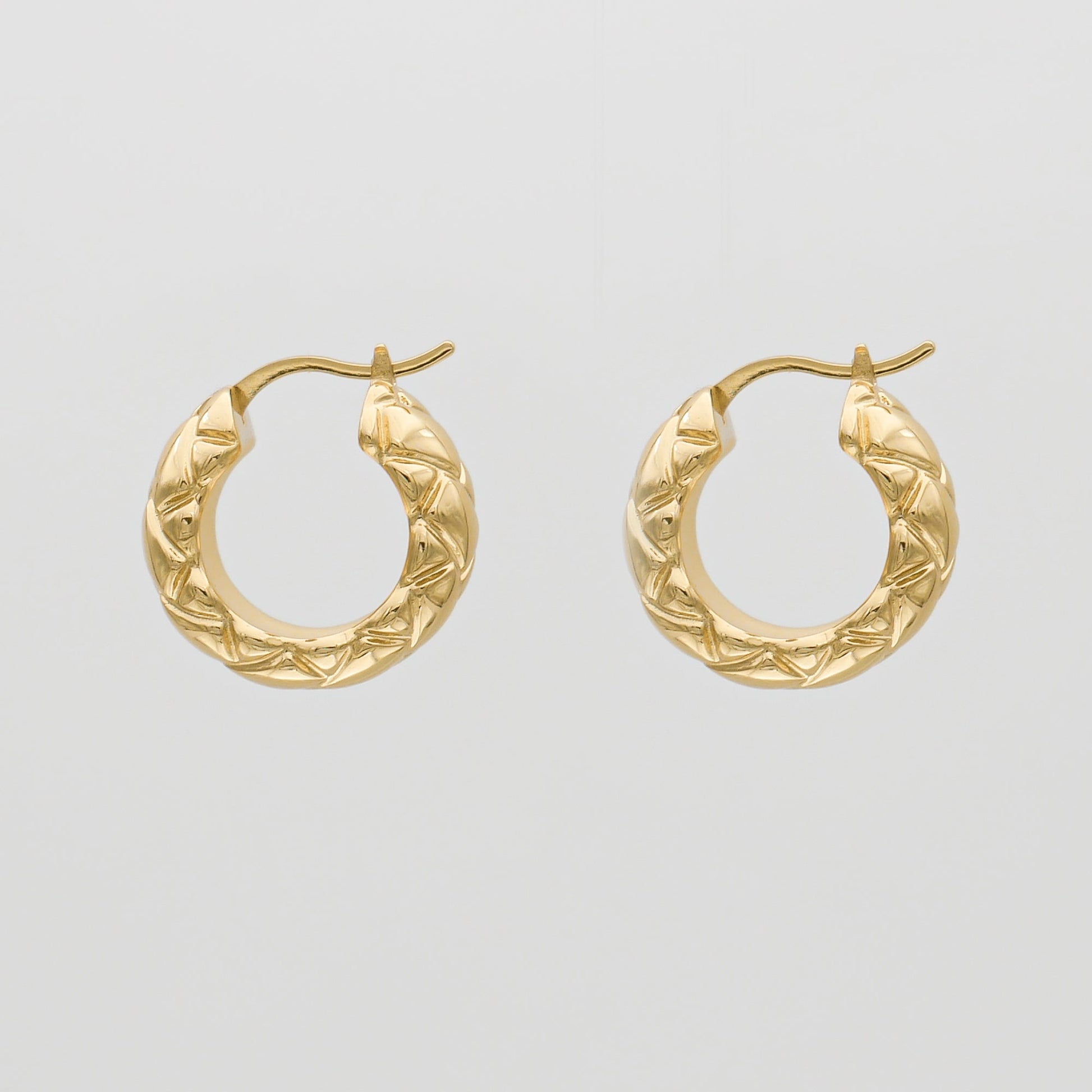 A contemporary classic. These Kyla hoop earrings feature a vintage-inspired quilted texture which creates a distinctive finish. Perfect to wear solo or pair with our huggies, a chain and some stacking rings for an impactful look.
