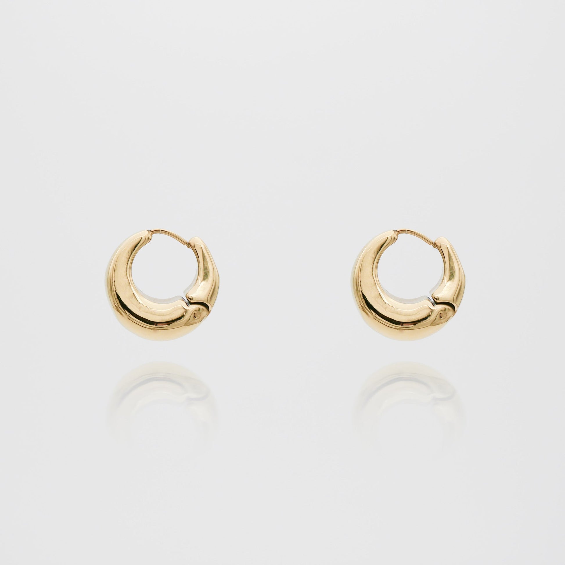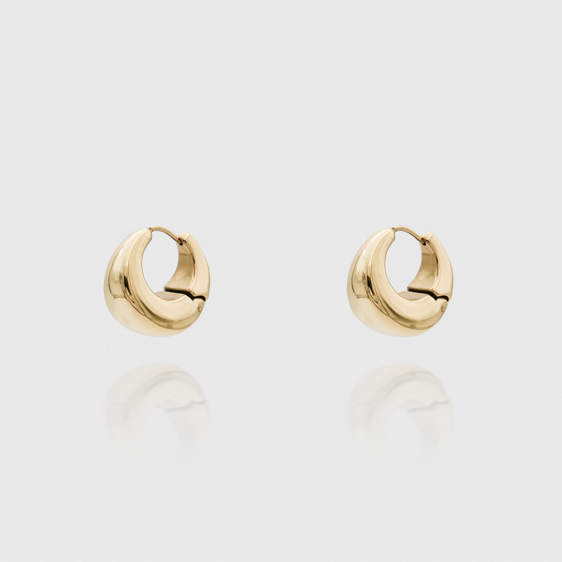 Elevate your everyday with our Lana Earrings, the perfect huggie earring for any occasion. Crafted from 18K gold plating, the Lana earring elegantly curves around your ear lobe with a graduating thick hoop that exudes boldness whilst remaining both timeless and understated. An everyday essential with an extra touch of glamour.