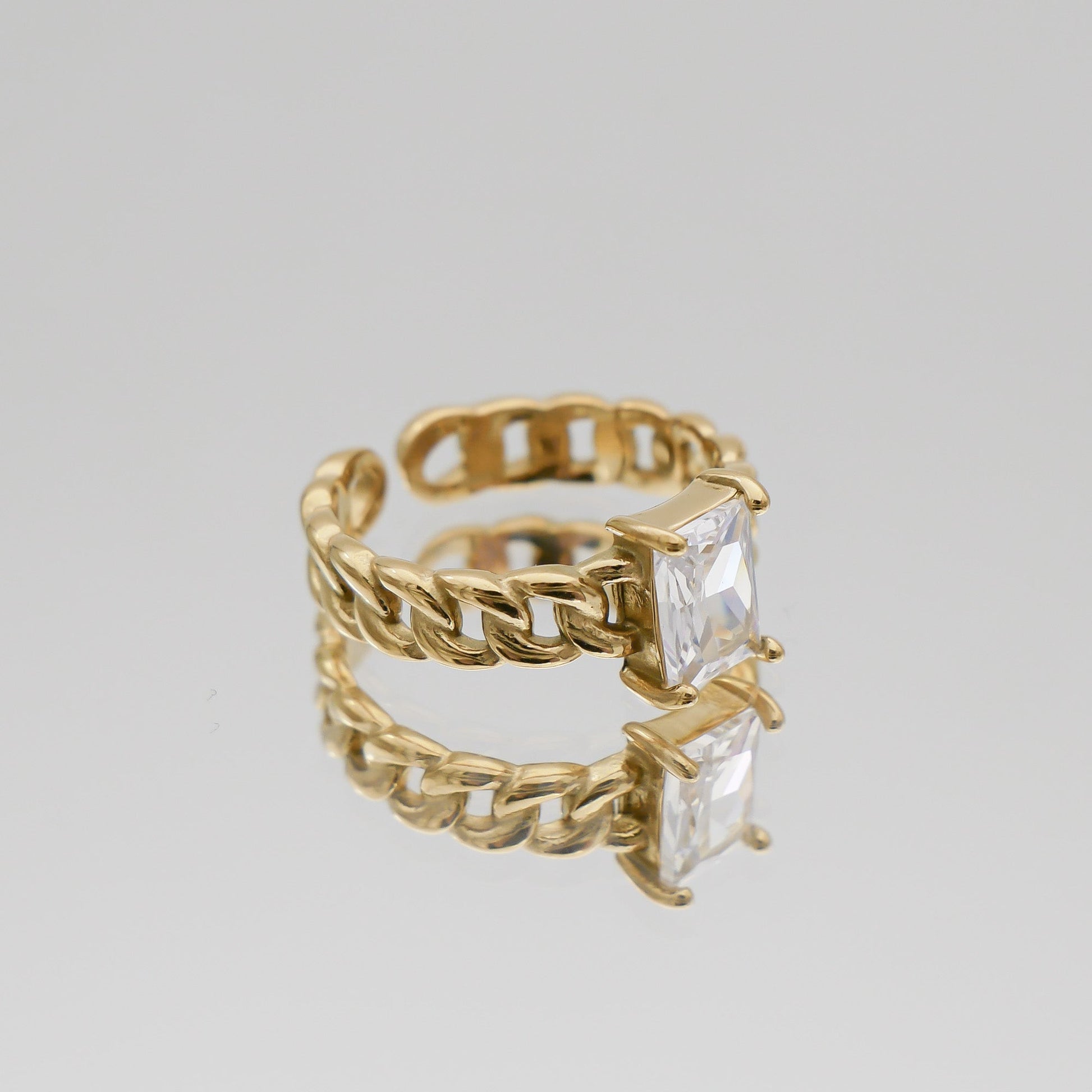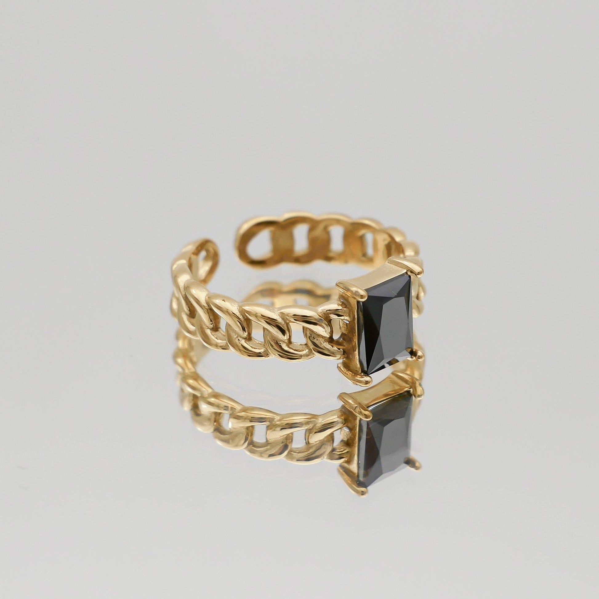 The Laria ring has a simple but superb design with its 18K gold plated stainless band. The design mimics the classic Cuban Link Chain we utilise on some of our most popular necklace chains for women. This time we’ve recreated it in ring format. The band is open at the back to allow for some slight adjustment and movement. The ends of the ‘chain’ are slightly rounded making it a comfortable fit. At the centre, the chains meet a square that has the central gem basket set in the middle. As this statement piece evokes a classy vintage look, there are two traditional choices of the central gem. The darkly alluring black onyx or the pure crystal cut of a clear cubic zirconia. Our Cubic Zirconia is the ultimate diamond alternative. It shares many of the same qualities as a diamond however is ravishing in its own right, producing more glimmers of colour & shine than a diamond. Plus, it is more ethical, being manmade in a lab, and less expensive than rare diamonds.