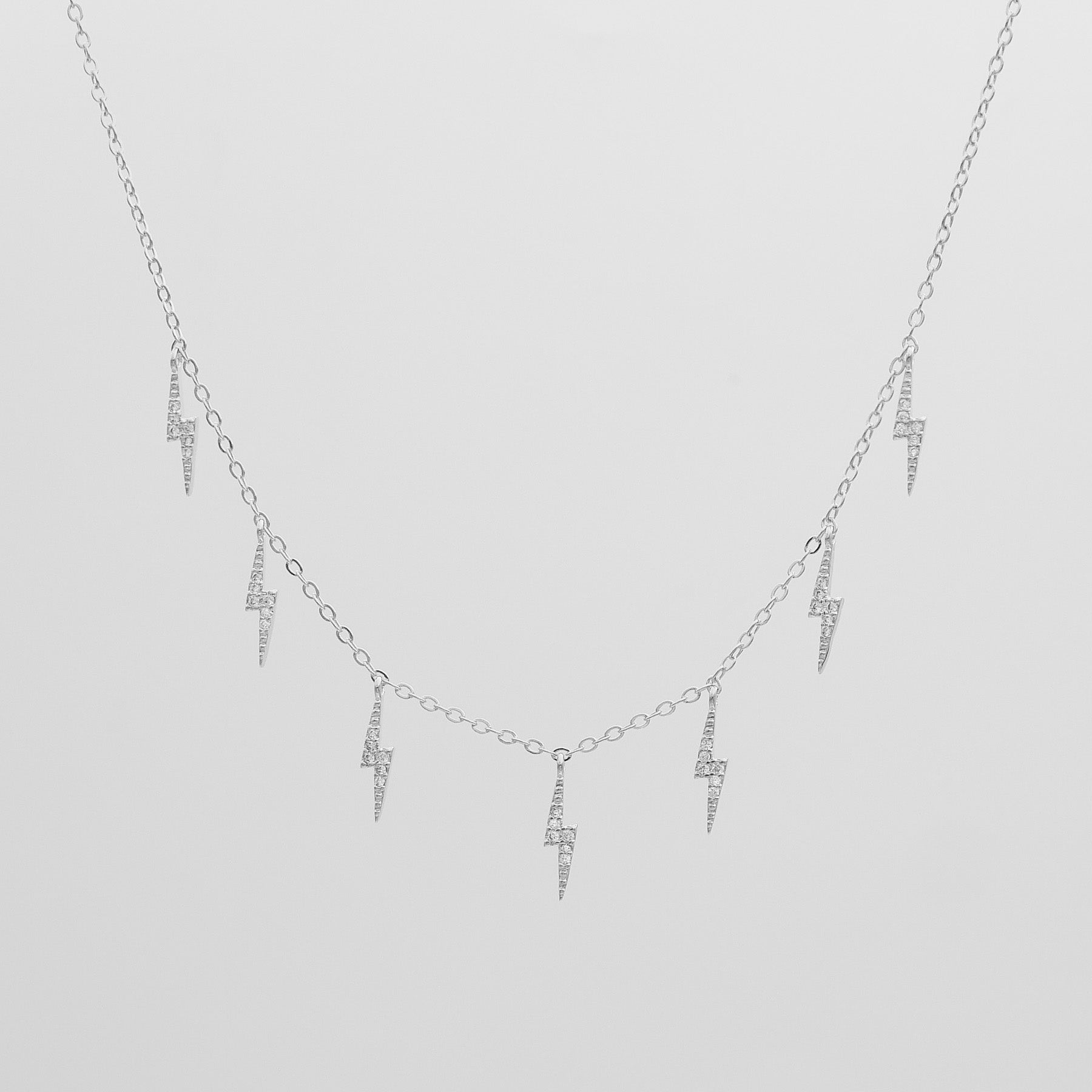 This dainty elegant choker features seven suspended lightning bolts all featuring beautiful CZ Crystals. Choose between 18k Gold or Silver plated. Let it shine on its own or layer with other necklaces