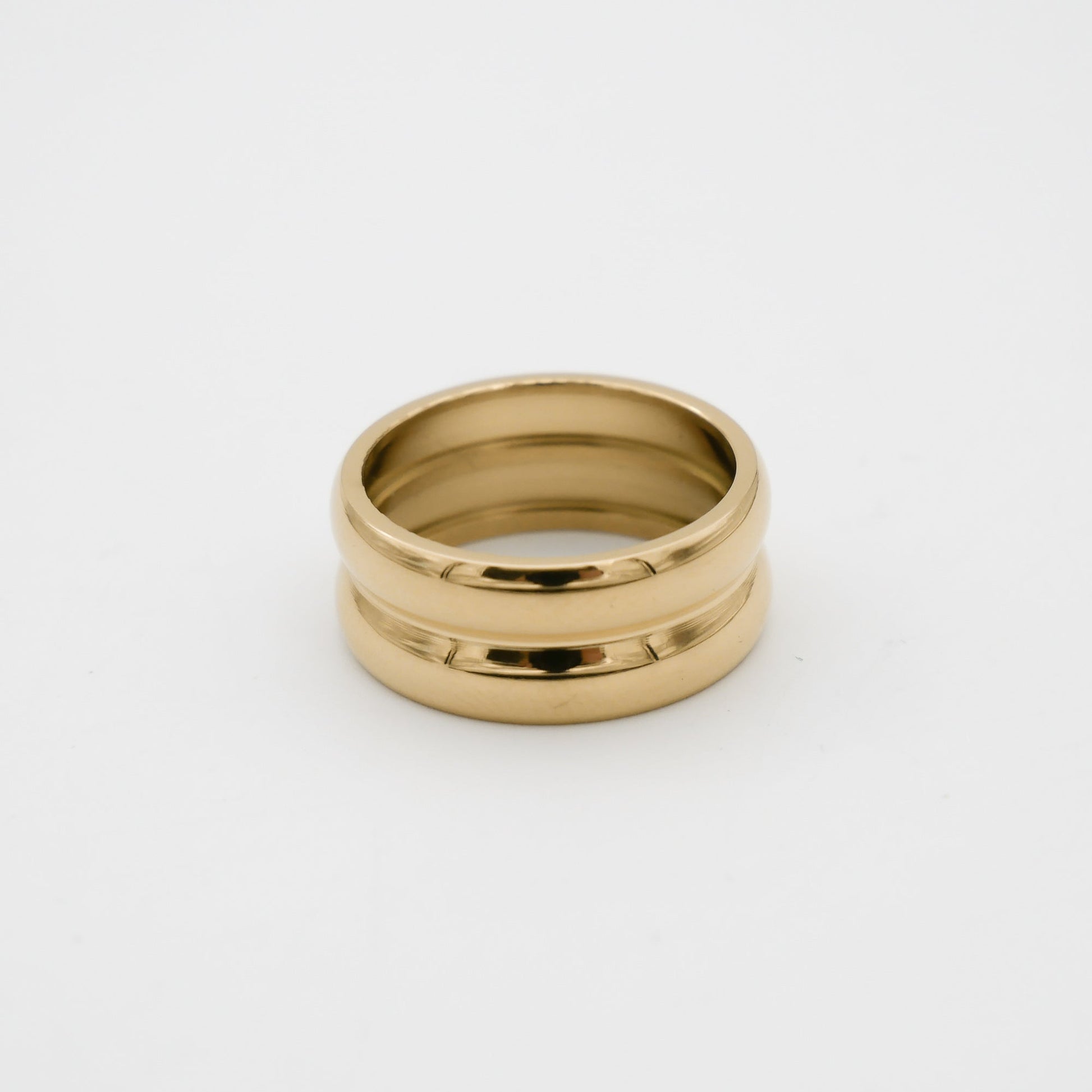 Introducing the Lina Ring, a stunning addition to your capsule jewellery collection. Crafted with 18k gold plating, this double banded ring twill elevate any outfit and make a bold in your ring stack. A must-have piece for any fashion-forward individual seeking timeless elegance.
