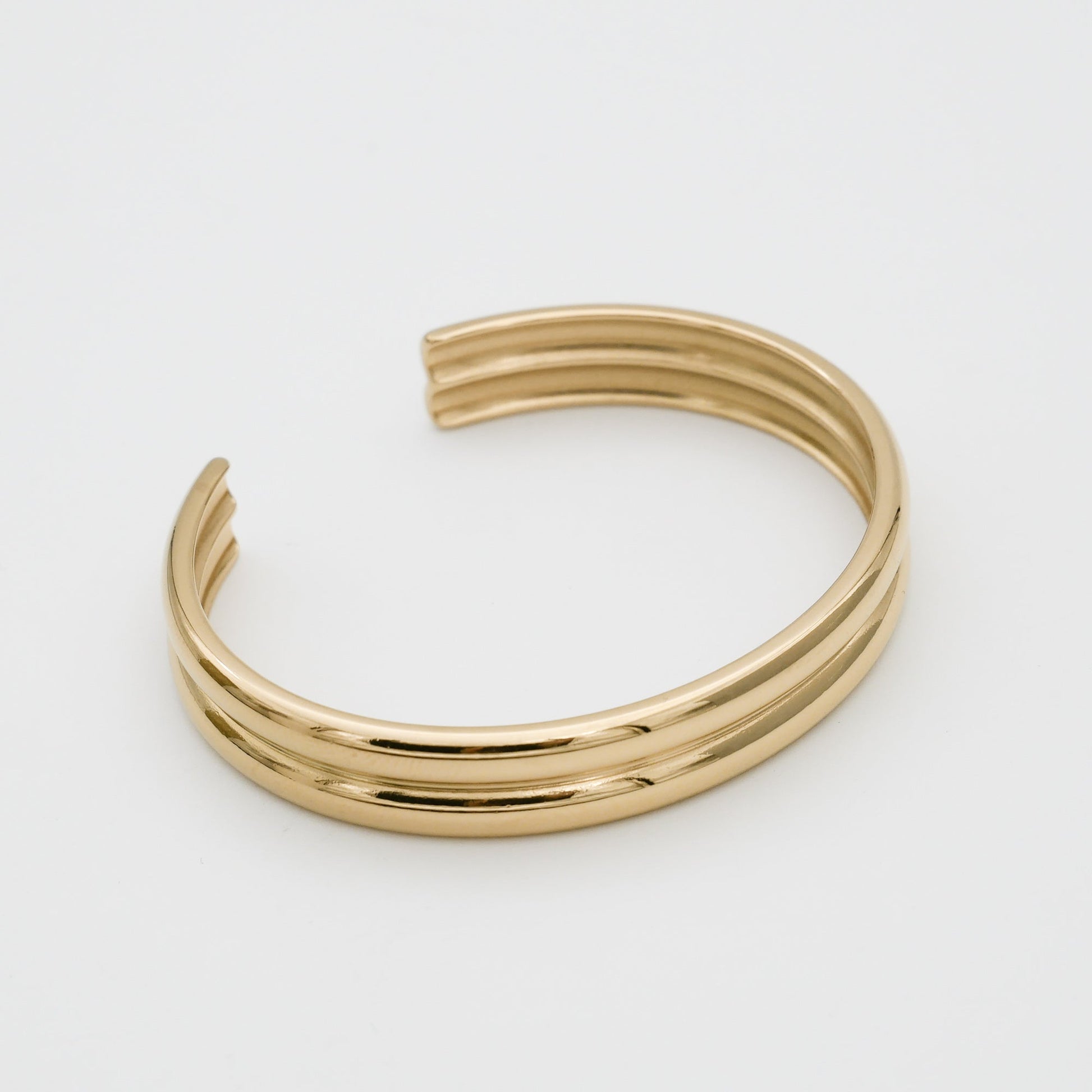 This stylish Lola Bracelet is crafted from gold-plated stainless steel with an adjustable bangle design that features ribbed detailing, measuring 9mm thick. Perfect for stacking, this gold bracelet is sure to instantly elevate any outfit.