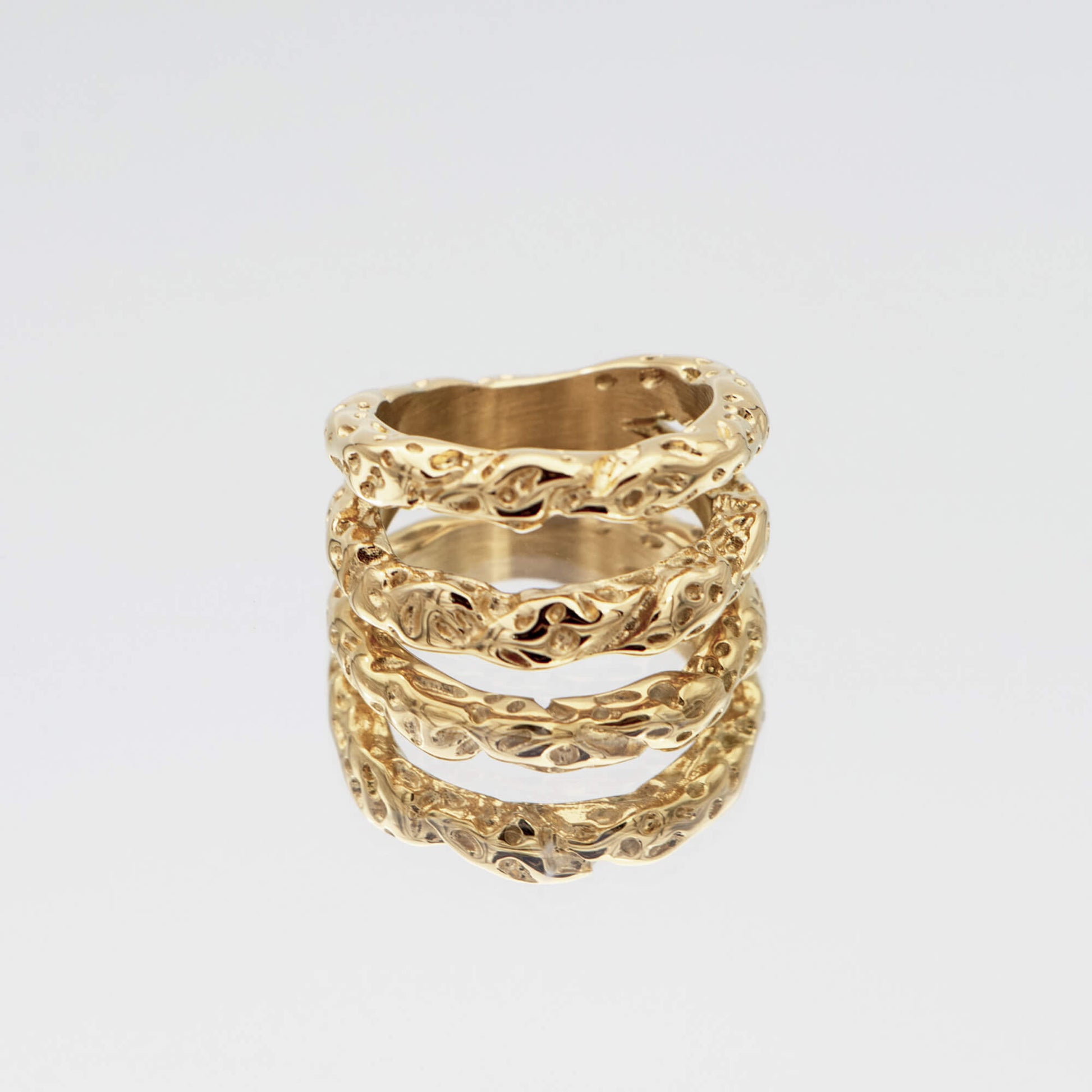 Our Luciana Ring features a double-layered Gold plated band with a unique sea urchin texture. Its distinctive hammered texture design adds a striking touch to your collection. The elegant craftsmanship make it a timeless, standout piece that complements any outfit.