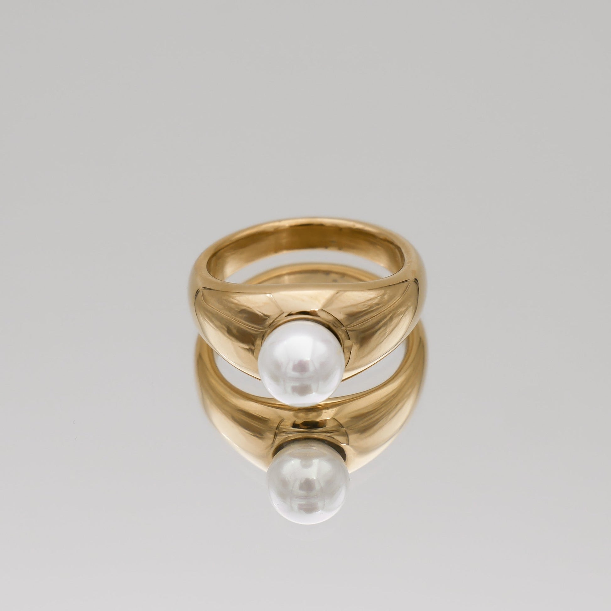 A striking embellished piece, with a vintage look and feel. The signet inspired design is delicately decorated with a pearl centre, and is crafted with a smooth, polished finish. Our Lydia pearl ring is a must have piece and can be paired with other items in our pearl collection.