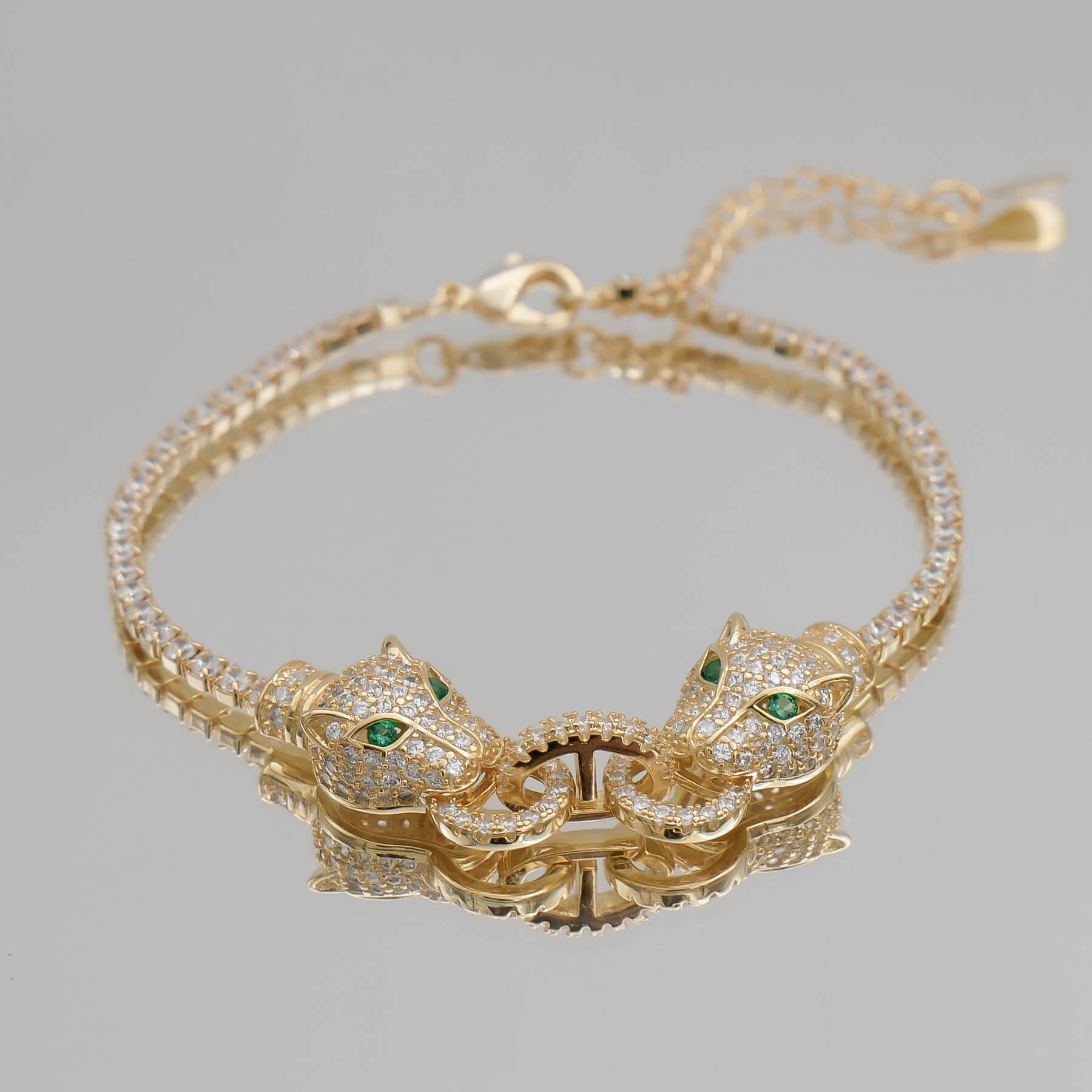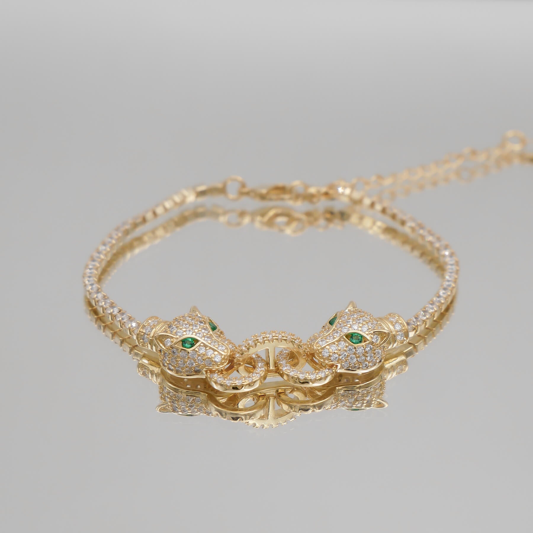 A captivating yet elegant piece, our Mowgli Jaguar bracelet features 2 beautifully crafted, detailed Jaguar heads attached by rolo links and suspended onto a tennis link chain. Each stone is carefully paved throughout the whole bracelet, with clear CZ stones and beautiful emerald stones as eyes, creating a mesmerising combination. This gorgeous bracelet will glisten stunningly solo or match with our emerald pieces to add some colour to your look.