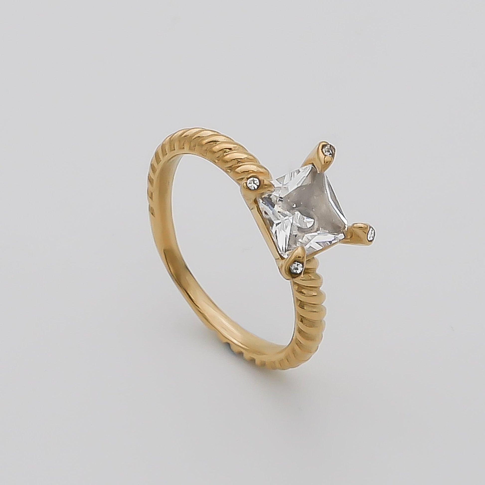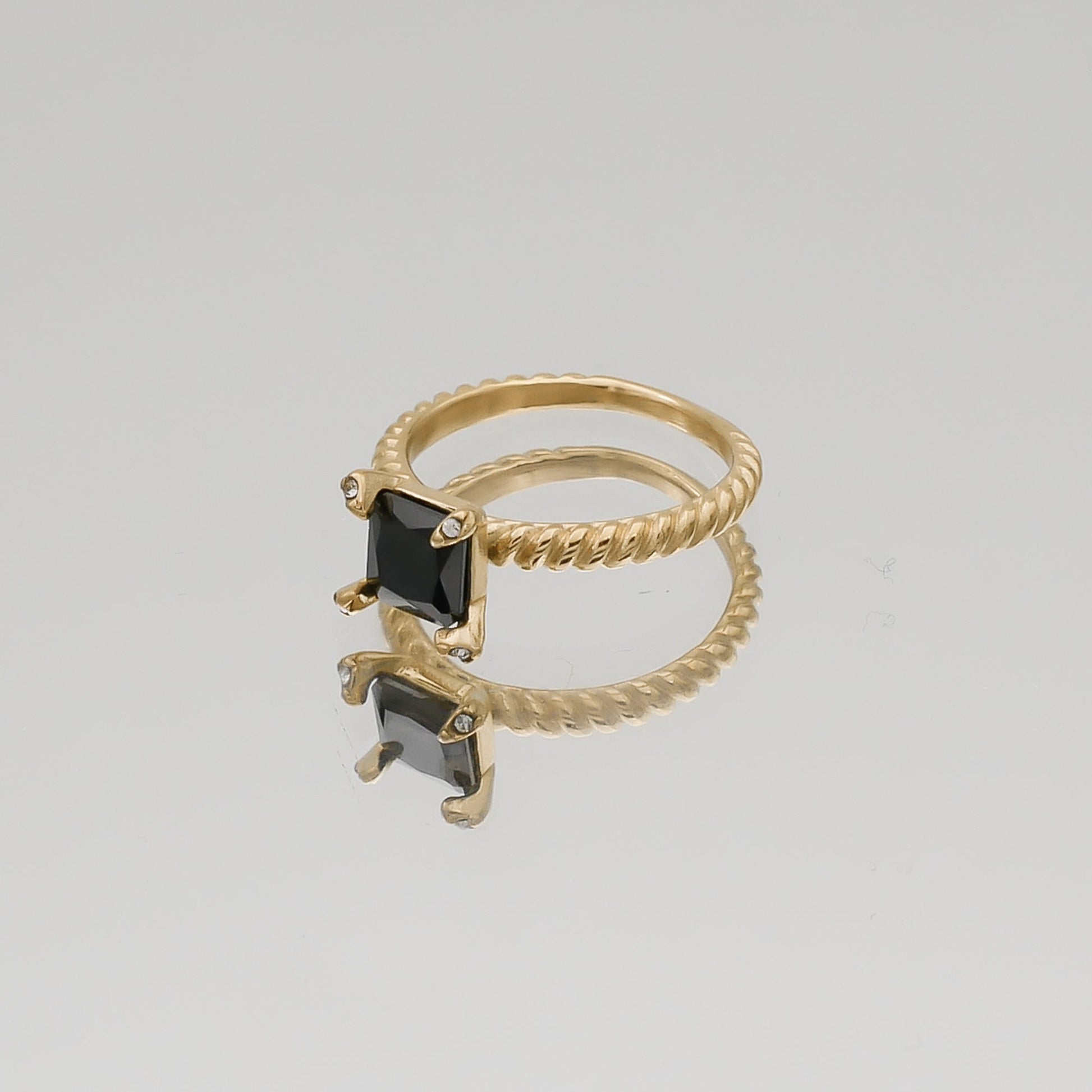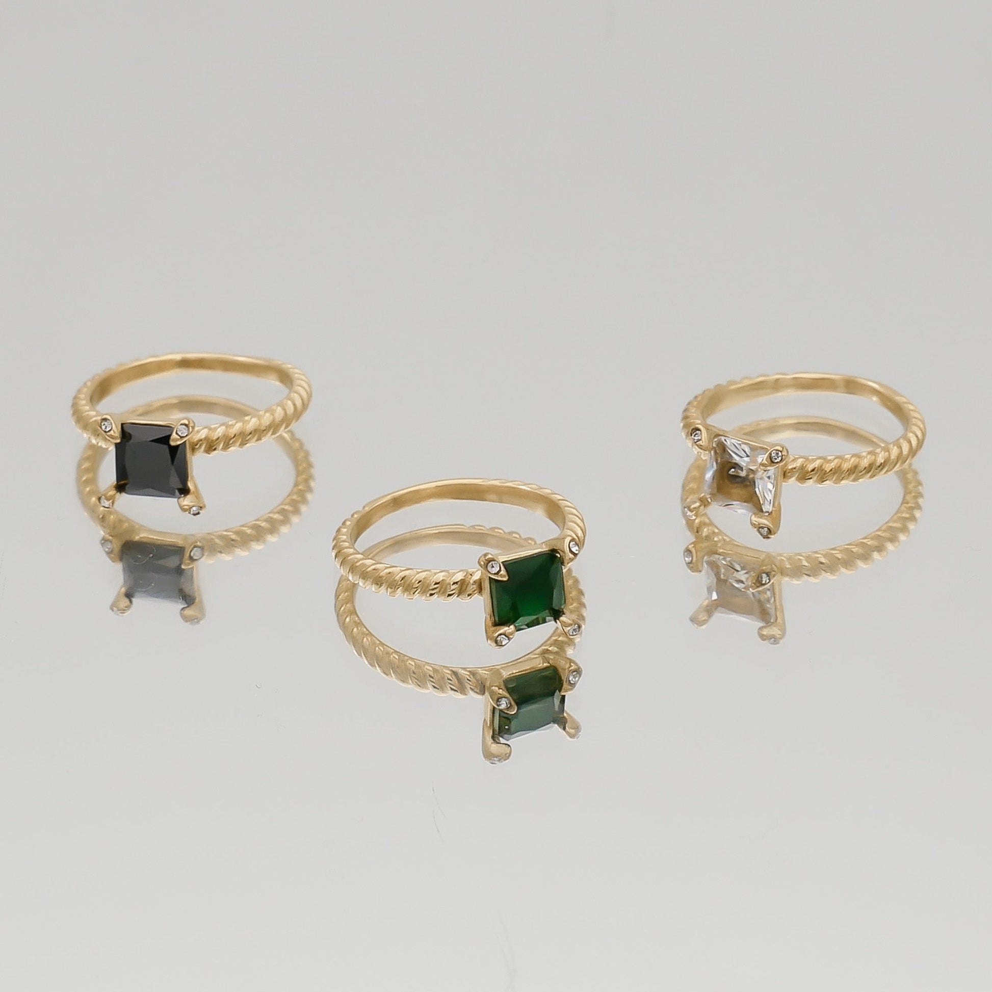The Mya Gemstone ring is crafted from 18K gold plated stainless steel which is shaped into a delicate, thin twist that wraps around the full band of the ring, finished with a gorgeous stone setting to add opulence. The chosen gemstone is set in the centre of the ring with a square, basket style setting. You can choose from a variety of colours, each with its own appeal. There is the emerald, with its glorious green colour that has that vintage inspiration and will make your friends green with envy of course. We also have a onyx gem that complements the gold of the band. Lastly, we have the classic, clear cubic zirconia. A staple piece no matter the outfit you choose. Our ring selection comes in three sizes, small, medium and large. Check out our size guide to find the right fit for you.