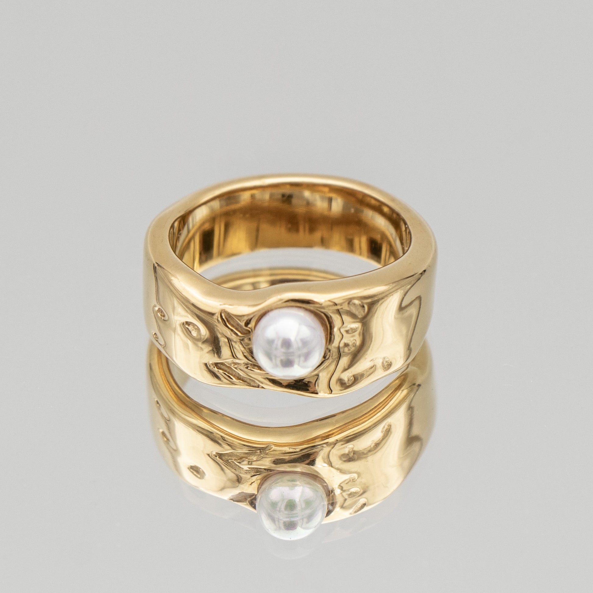Channel your inner mermaid with the Nadine Pearl Ring, featuring a lustrous pearl set in a gold textured waved band. Perfect for ring stacking or worn on its own, this piece adds a sophisticated and luxurious touch to your collection.