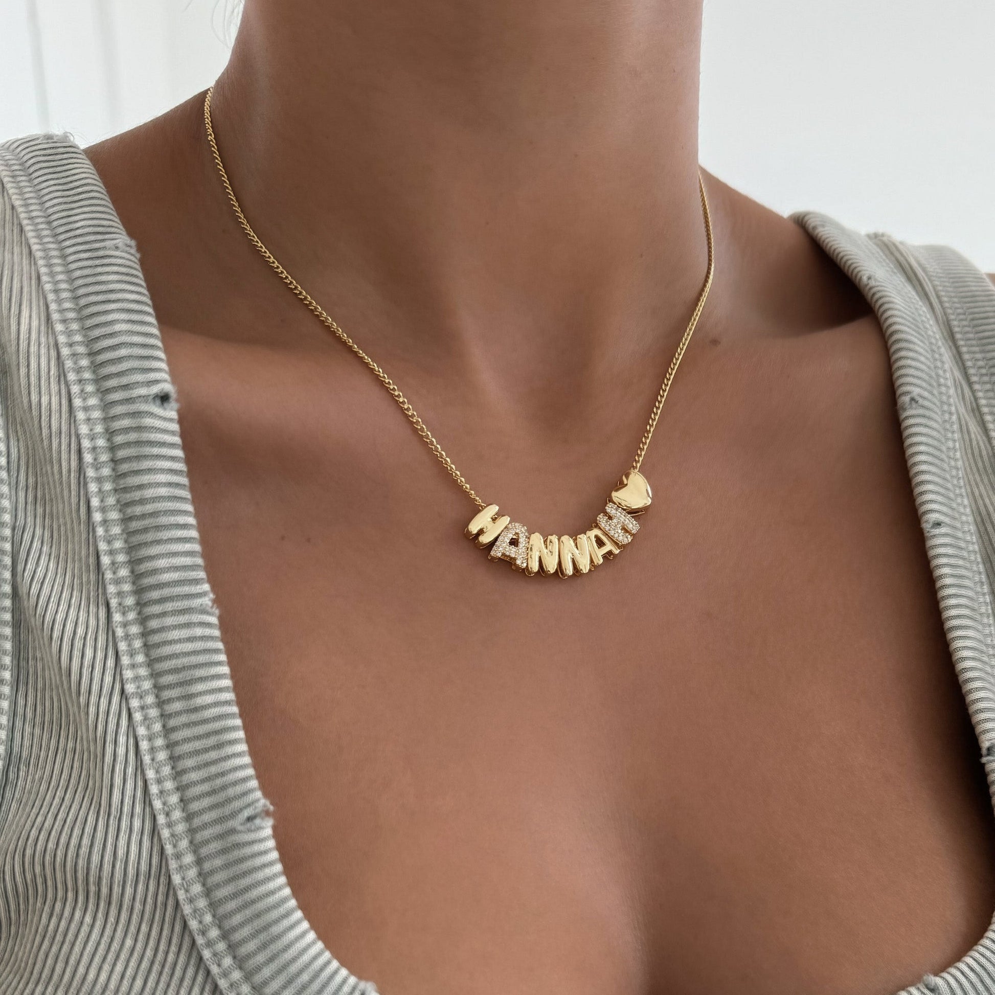 Unveil your Y2K personality and individuality with PRYA's Iconic Personalised Bubble Necklace. Crafted with precision and care, this unique design is fully personalisable and allows you to build your own bespoke jewellery statement. Pick from three exquisite chain options - Rope, Tennis or Mini Curb Chain - available in 18K Gold or Silver finishes and a choice of fun bubble balloon-shaped letters, numbers, & symbol, and heart charm.