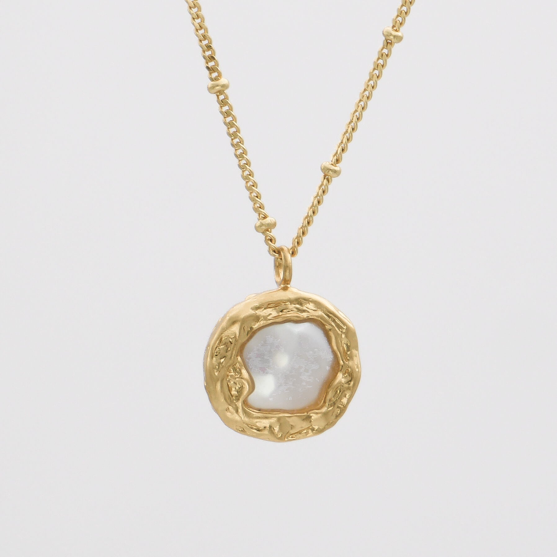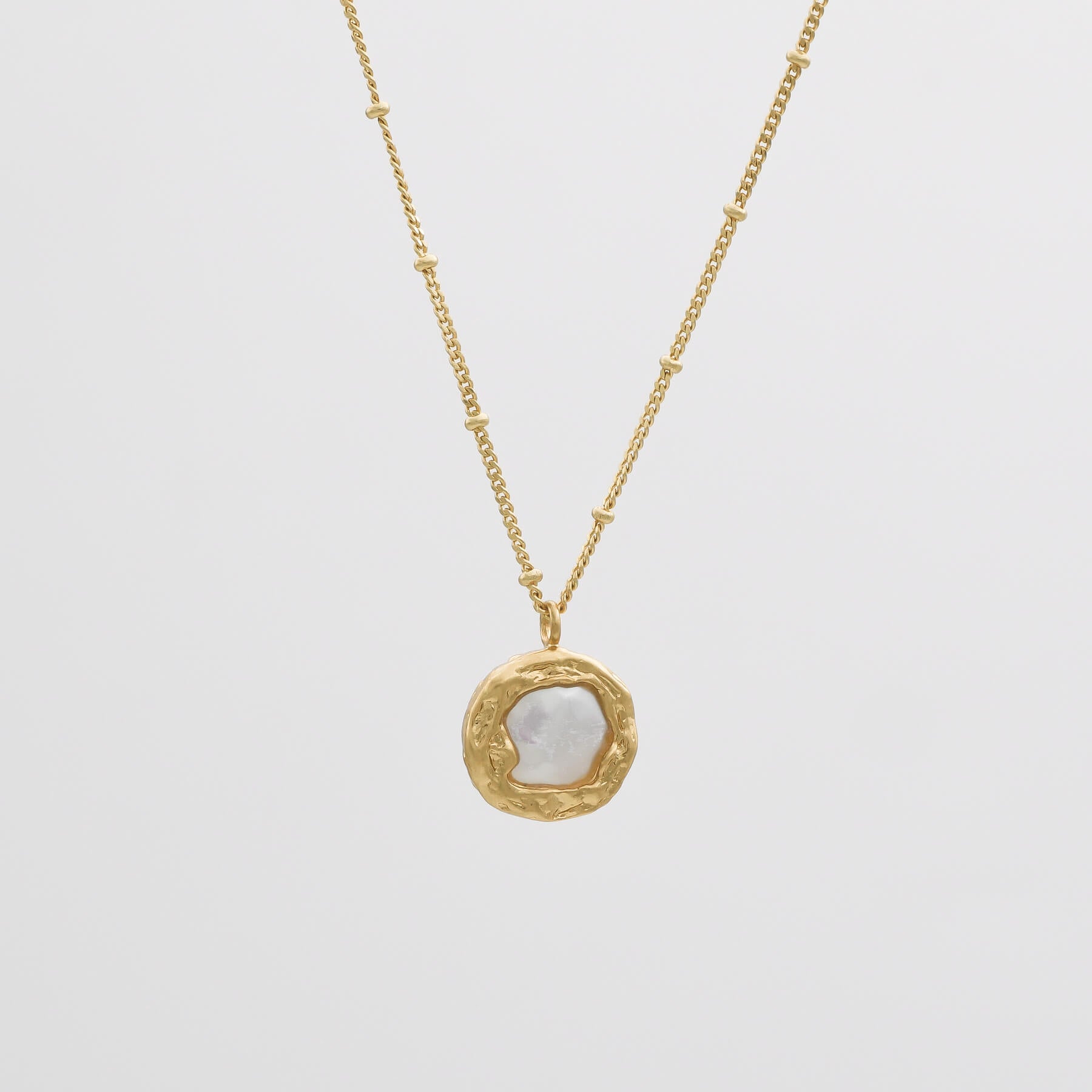 The shiny, silky iridescent Pearl necklace exudes elegance. The stone is expertly and perfectly polished for maximum shine then carefully wrapped and finished in a 18k gold plated design, creating a stunning combination.