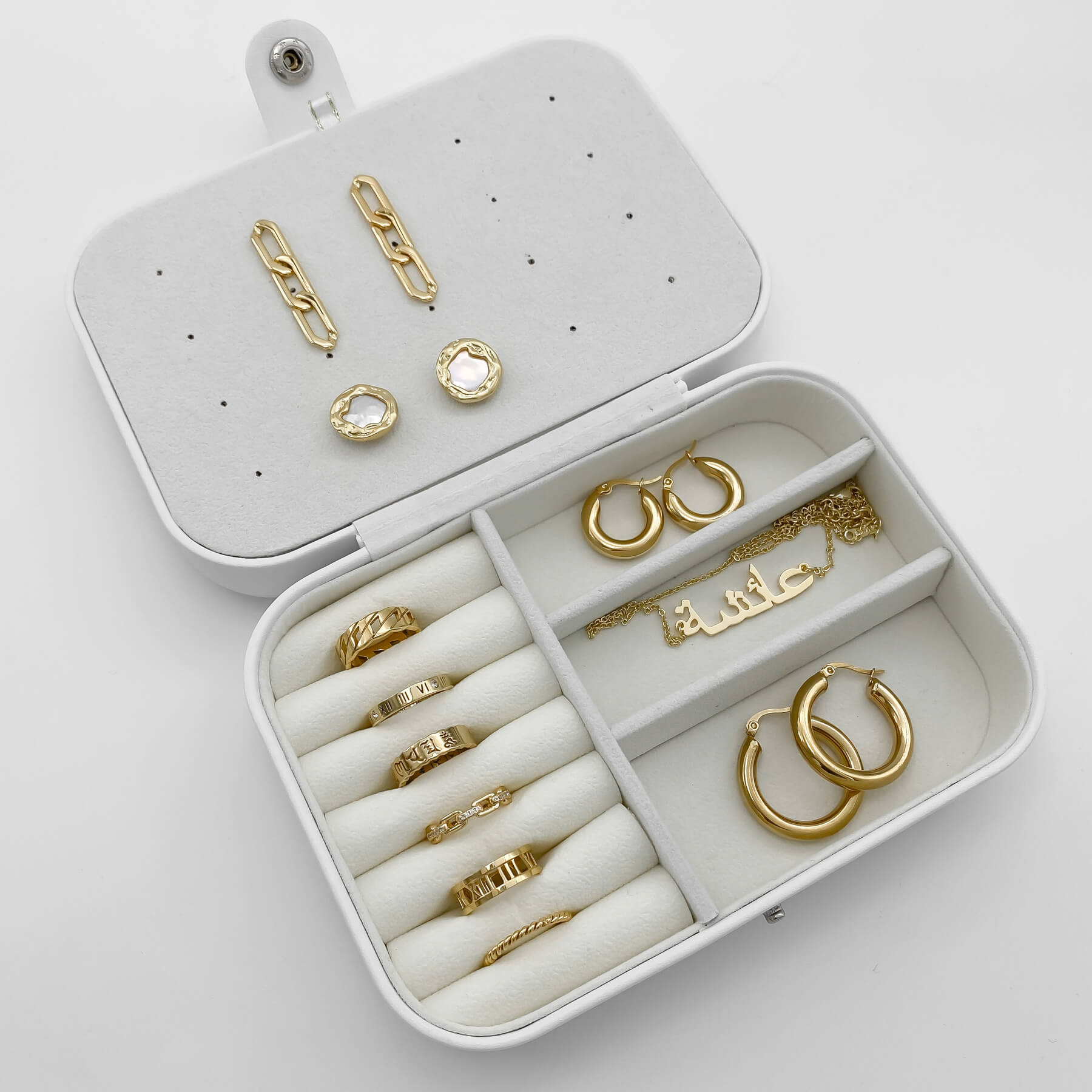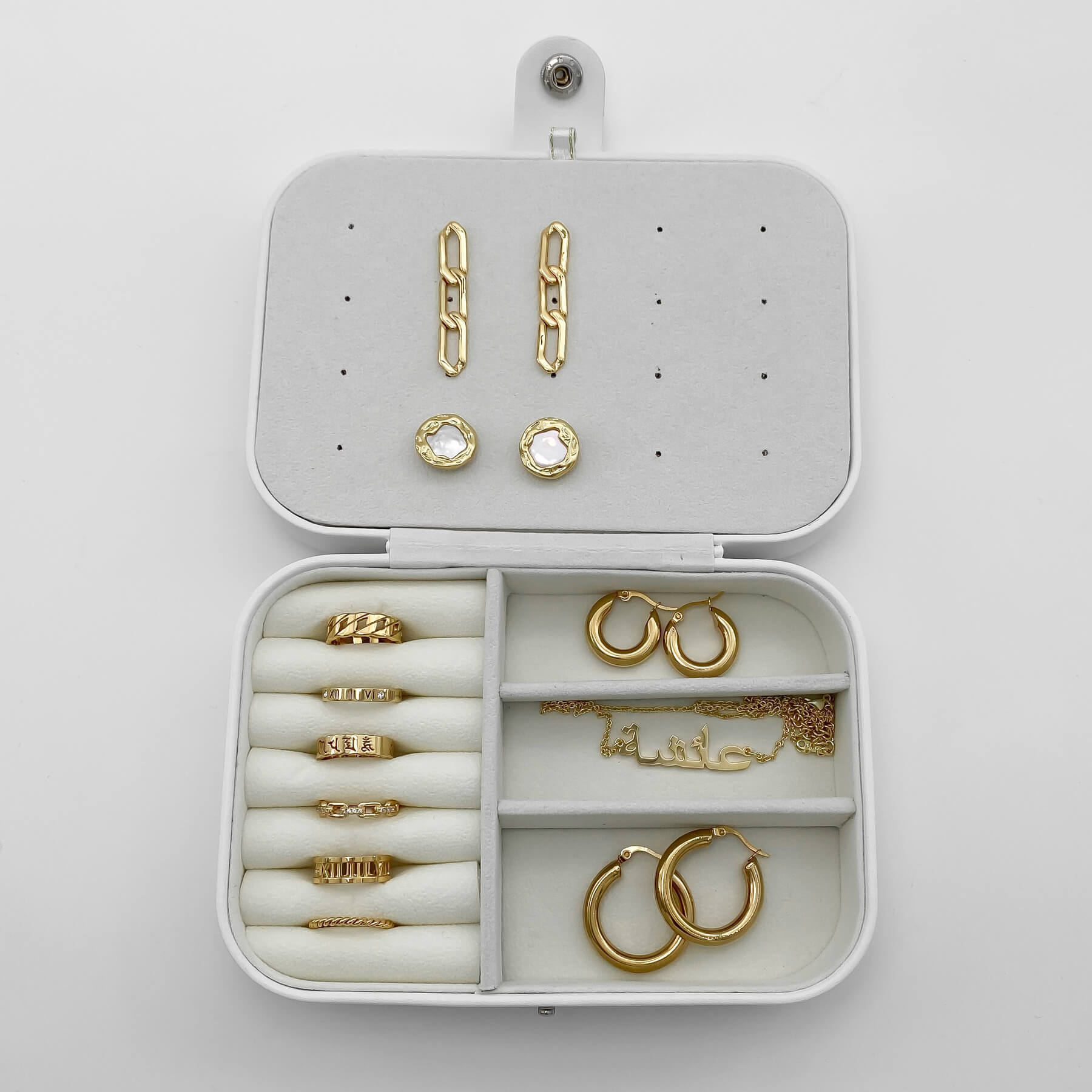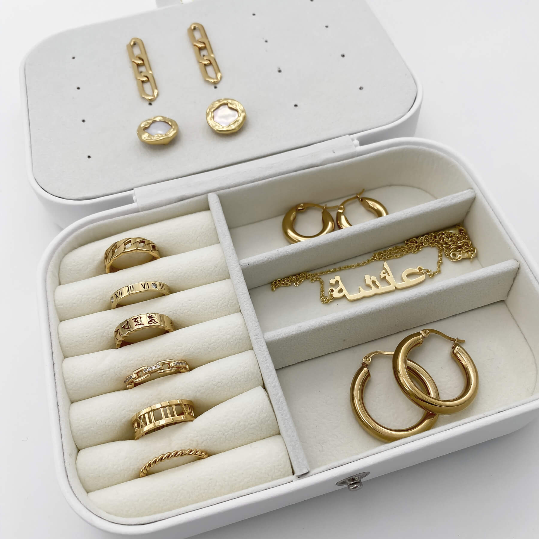 Store your gorgeous jewellery in the PRYA Luxury Jewellery box. Our Jewellery Box is made from white leather with a soft lining to protect your precious jewellery. A must-have for your jewellery collection or keep your jewellery close to you, on your your travels. Featuring cushioned ring rolls for rings, two sections for earrings and necklaces and three handy compartment for other accessories. There is plenty of space for your favourite jewellery pieces!