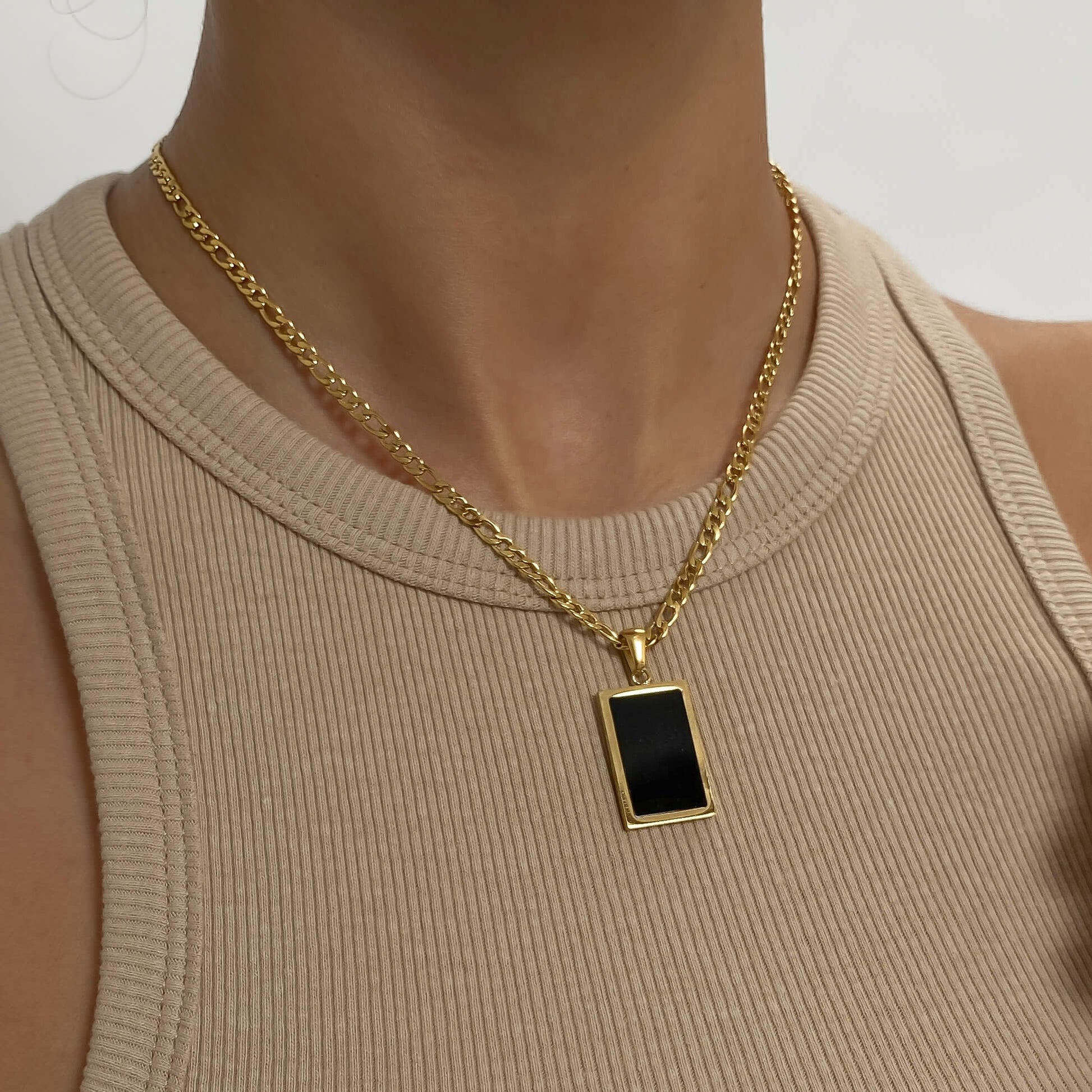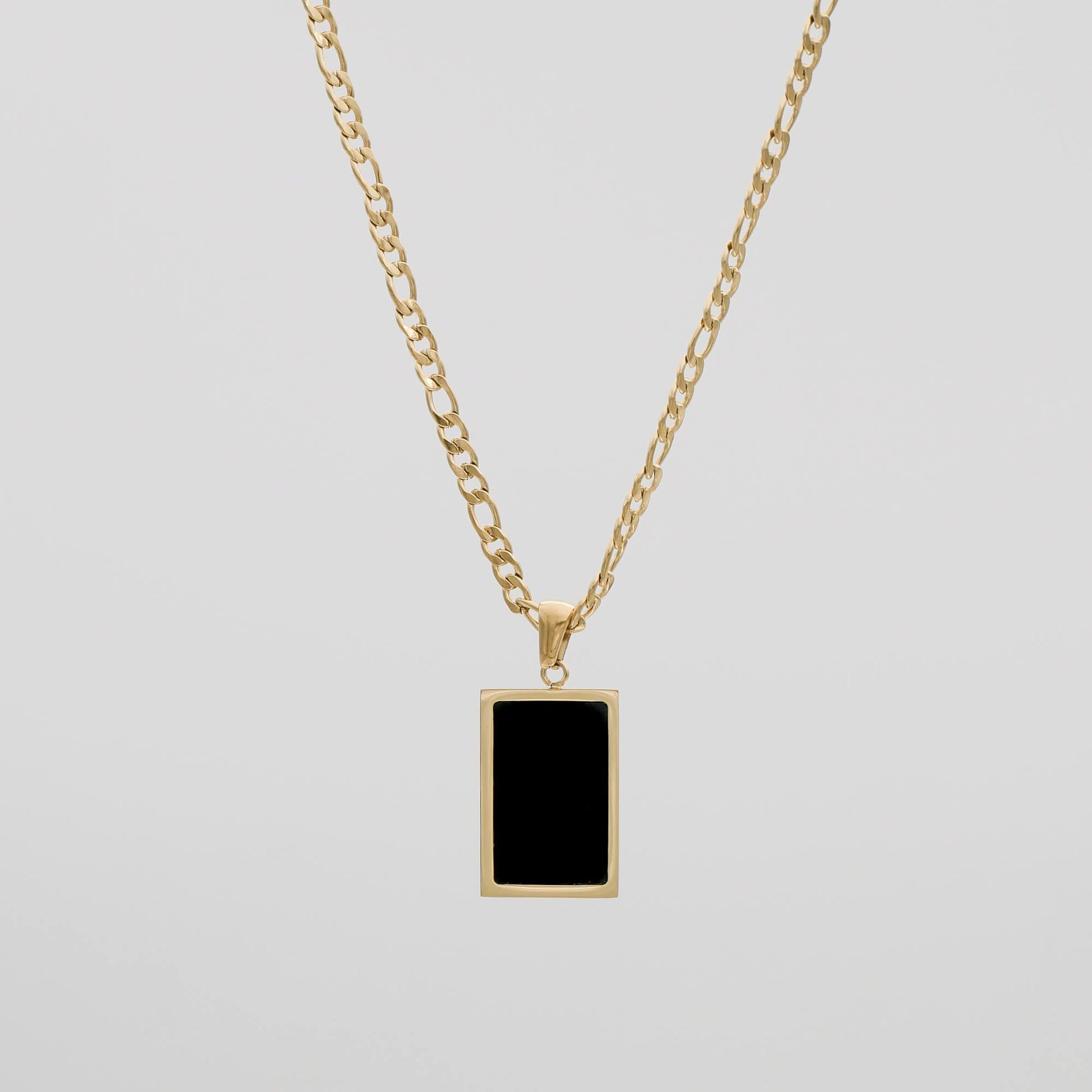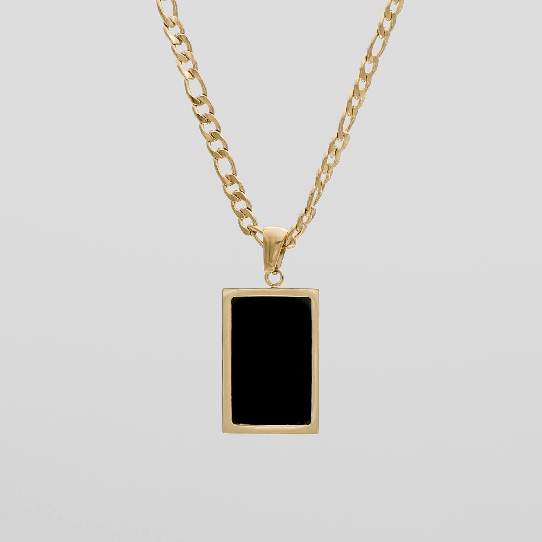 This statement Necklace features a stunning onyx stone set inside a 18k gold plated tablet & suspended on our figaro chain.