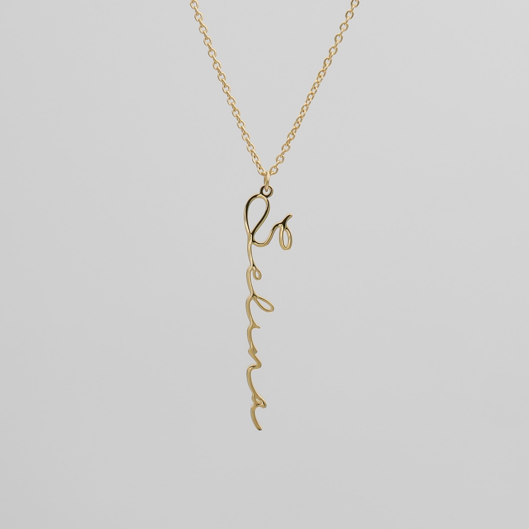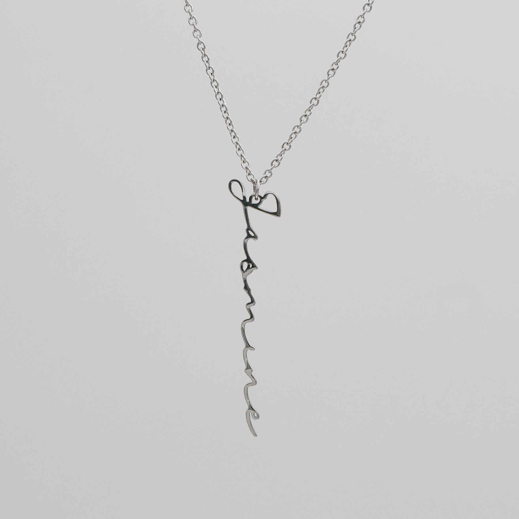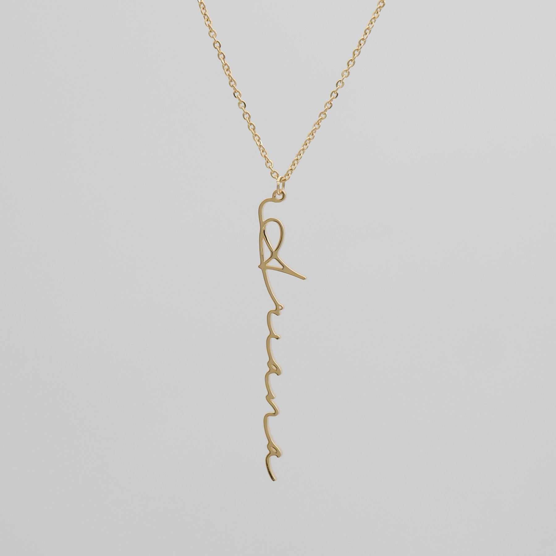 Elevate your style with the Selina Custom Name Necklace, showcasing a sophisticated vertical design that adds a contemporary flair to any look. Made with your choice of 18k gold plating, 14k rose gold, or silver-plated stainless steel, this necklace offers a perfect balance of durability and elegance.
