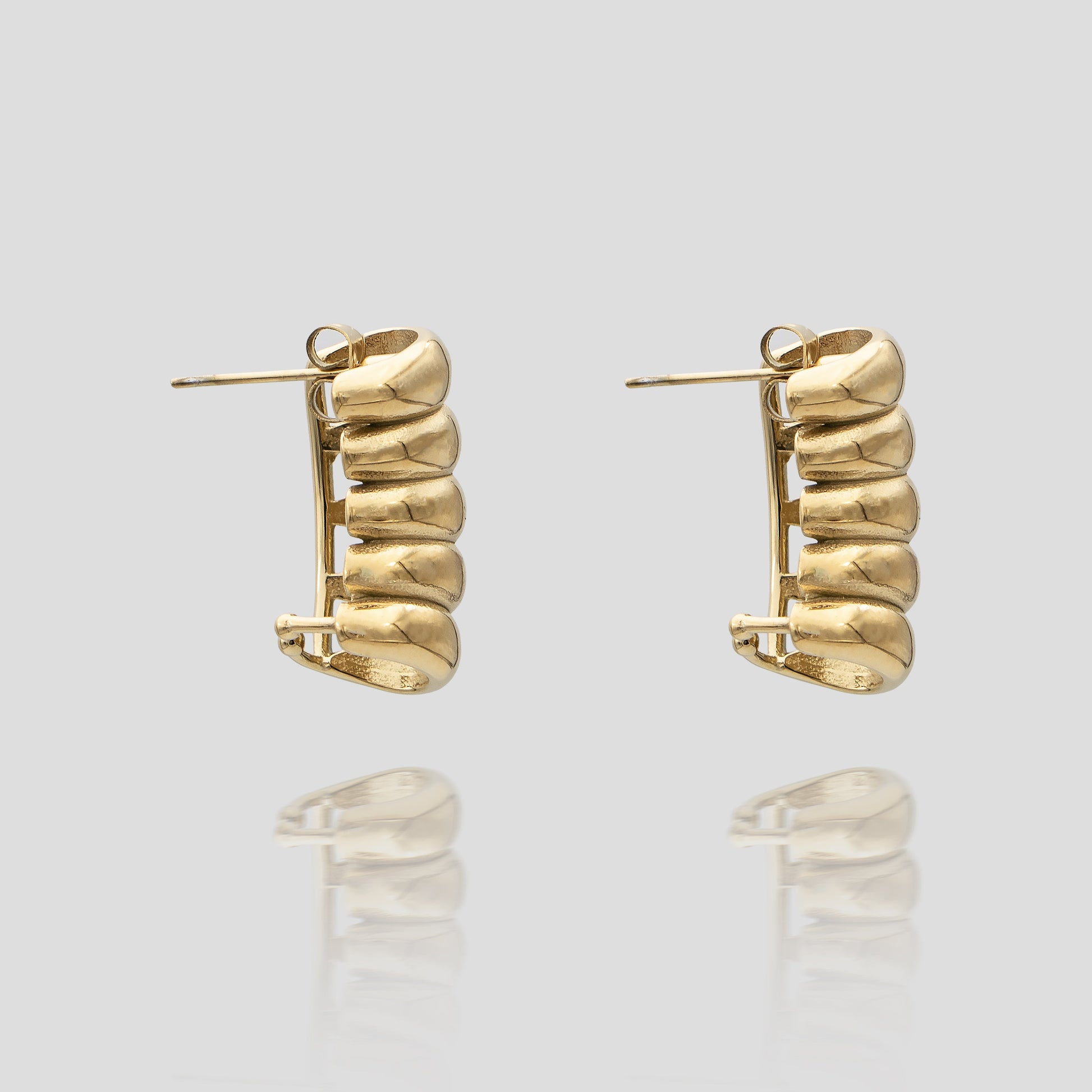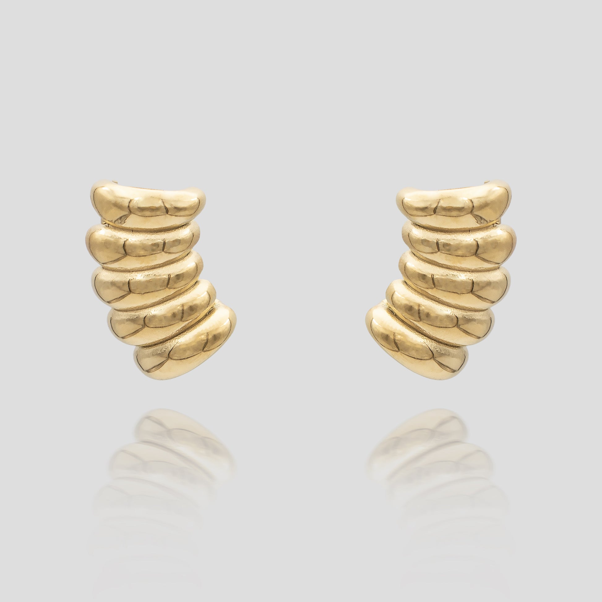 Elevate your style with our Tamira Earrings, crafted with meticulous attention to detail in 18k plated gold. The scrunched texture catches the light beautifully, adding a touch of classic sophistication to any outfit. Experience the elegance and exclusivity of these gold earrings.