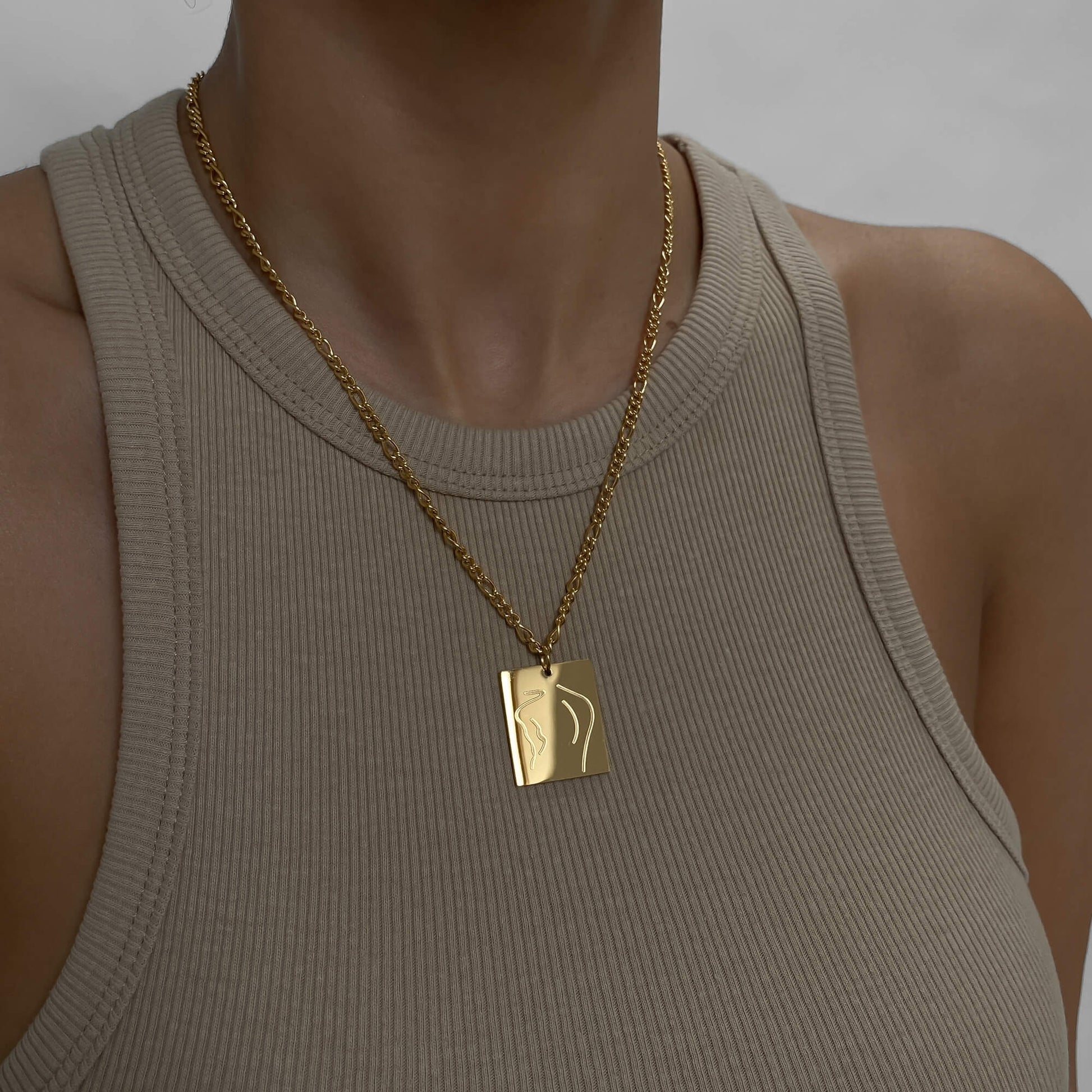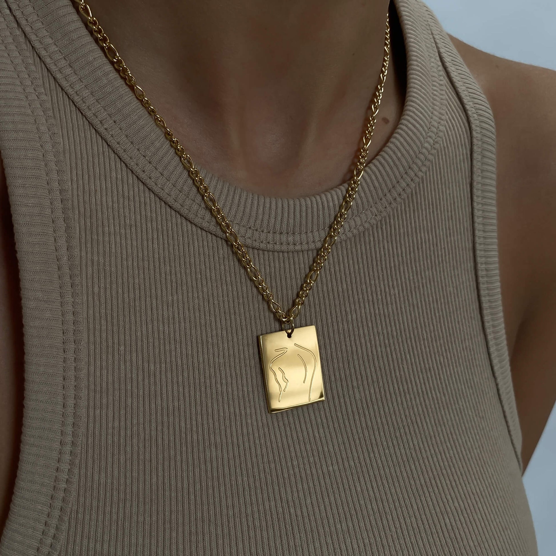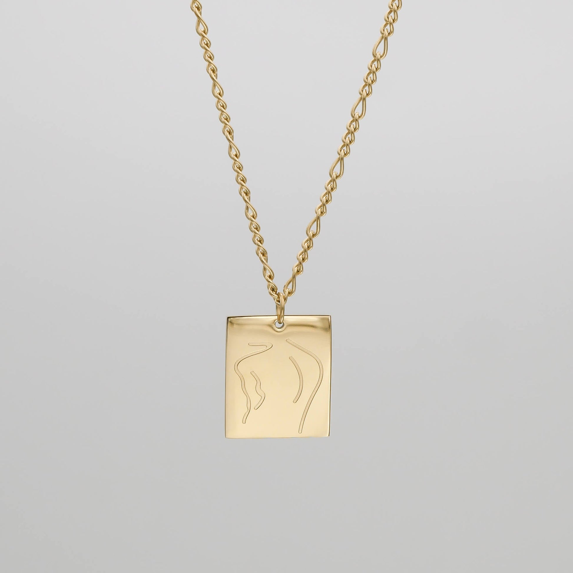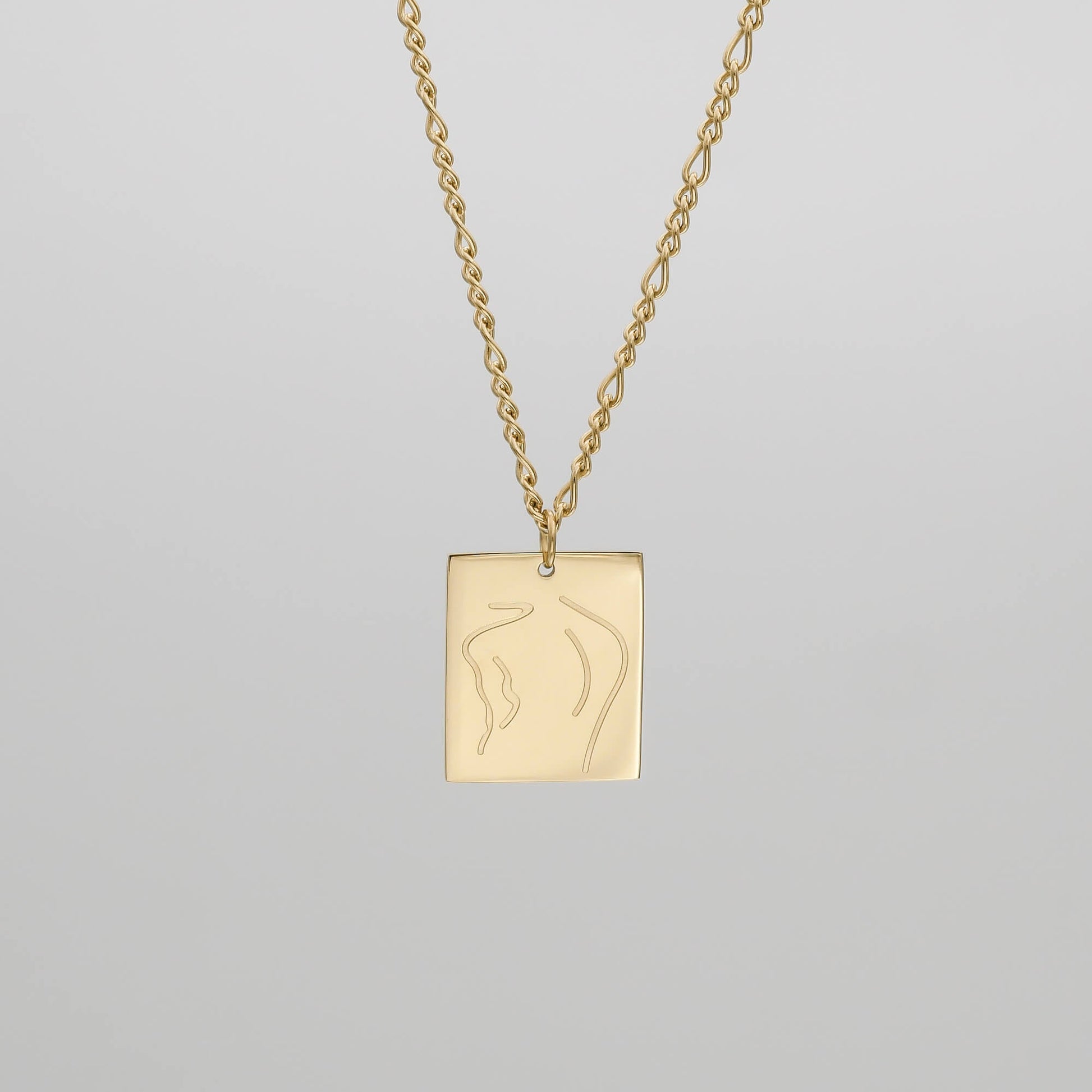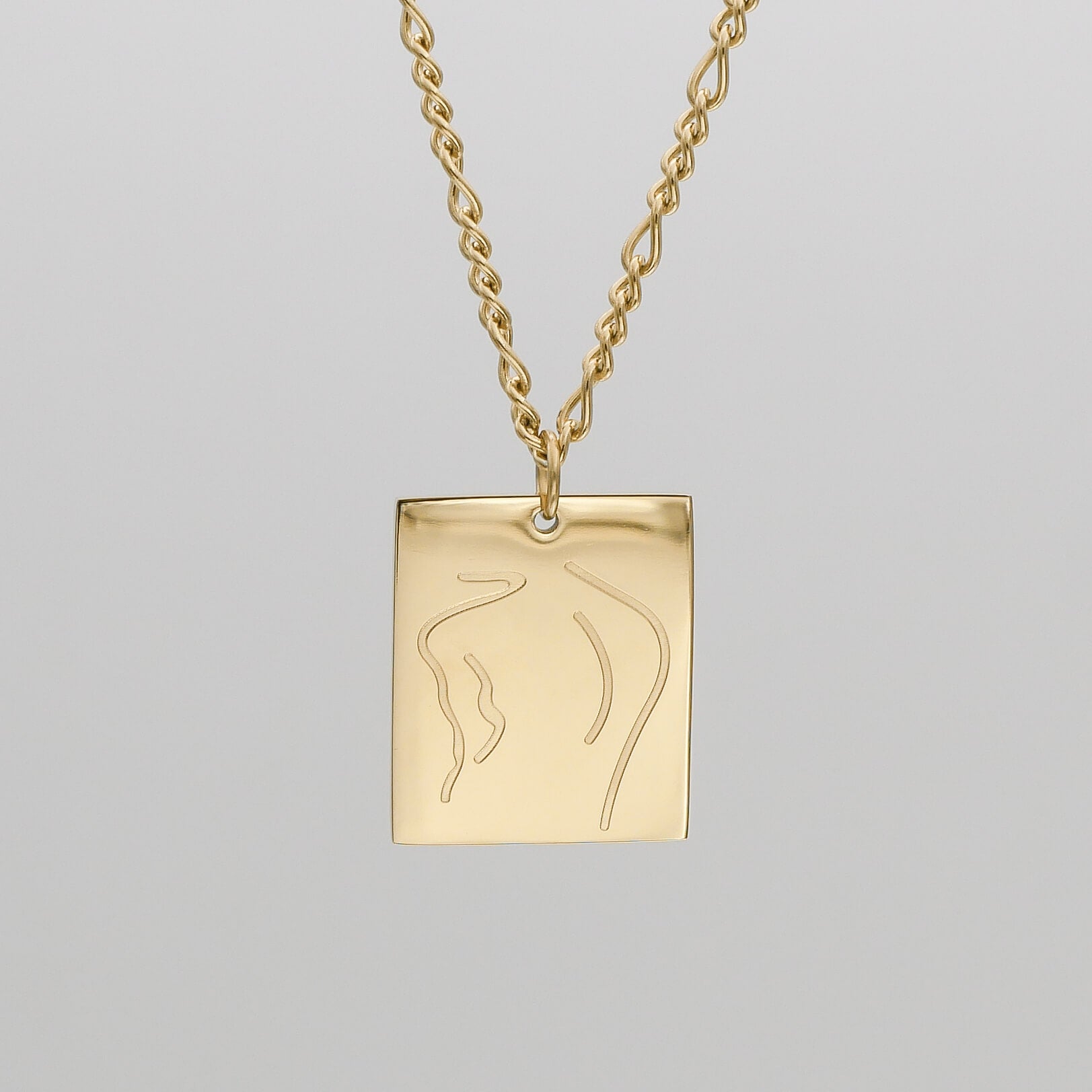 This elegant Necklace features a beautifully crafted 18k gold plated tablet with an engraved female figure, suspended on a Figaro chain.