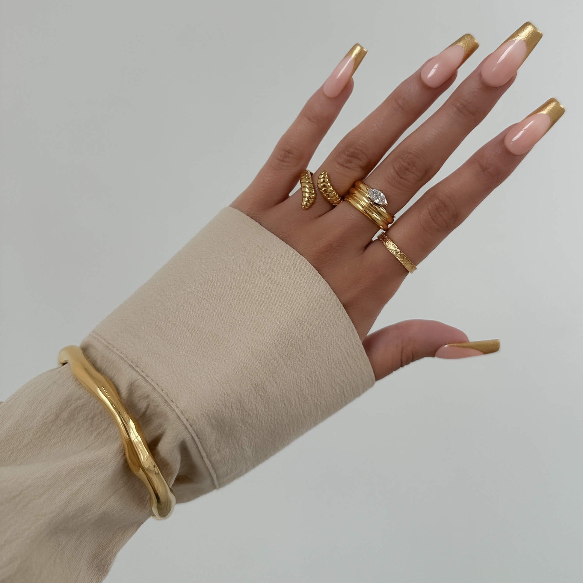 Introducing the Thea Bangle, a minimalist textured gold bracelet with a subtle wavy design. Its open silhouette allows for easy wear and versatility. Stack or wear solo, this sleek and modern piece is perfect for any occasion. Pair with a dainty ring for a sophisticated touch.