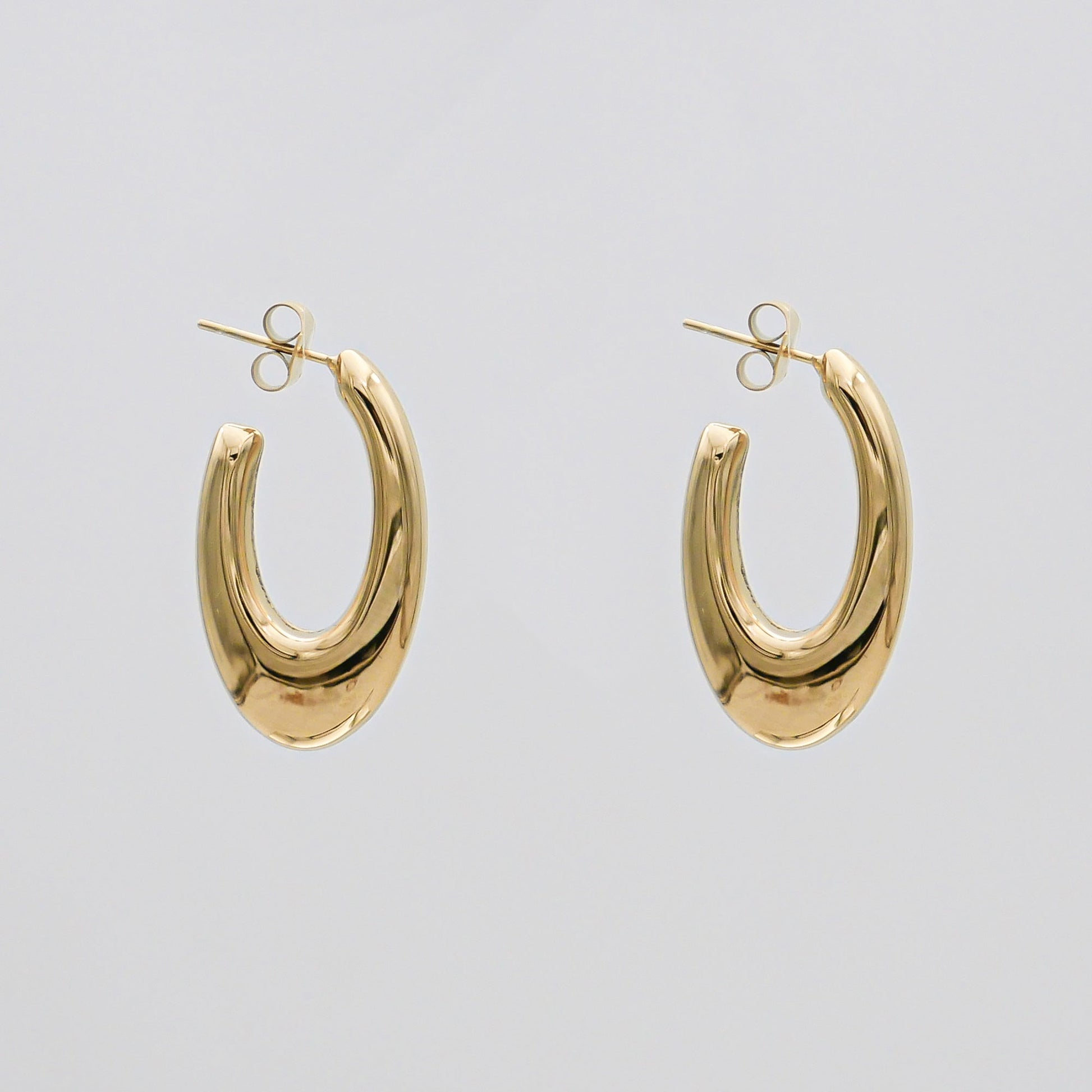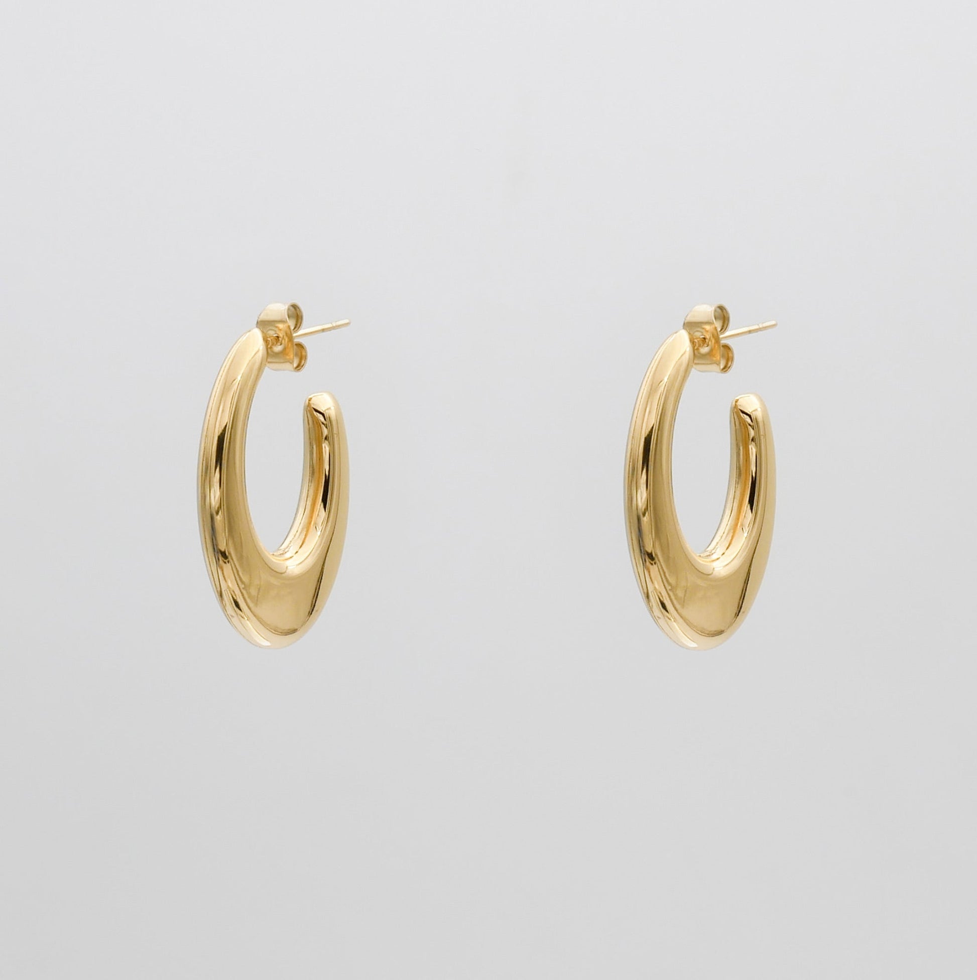 The stunningly elegant Thea Earrings add a beautiful twist on the timeless classic hoop earrings. Featuring an elongated oval shaped design to compliment your ensemble. Our bold Thea hoops will compliment any look and are a great addition to your jewellery box. Pair with your ear cuffs, a classic pendant necklace and stack your rings to complete your look.