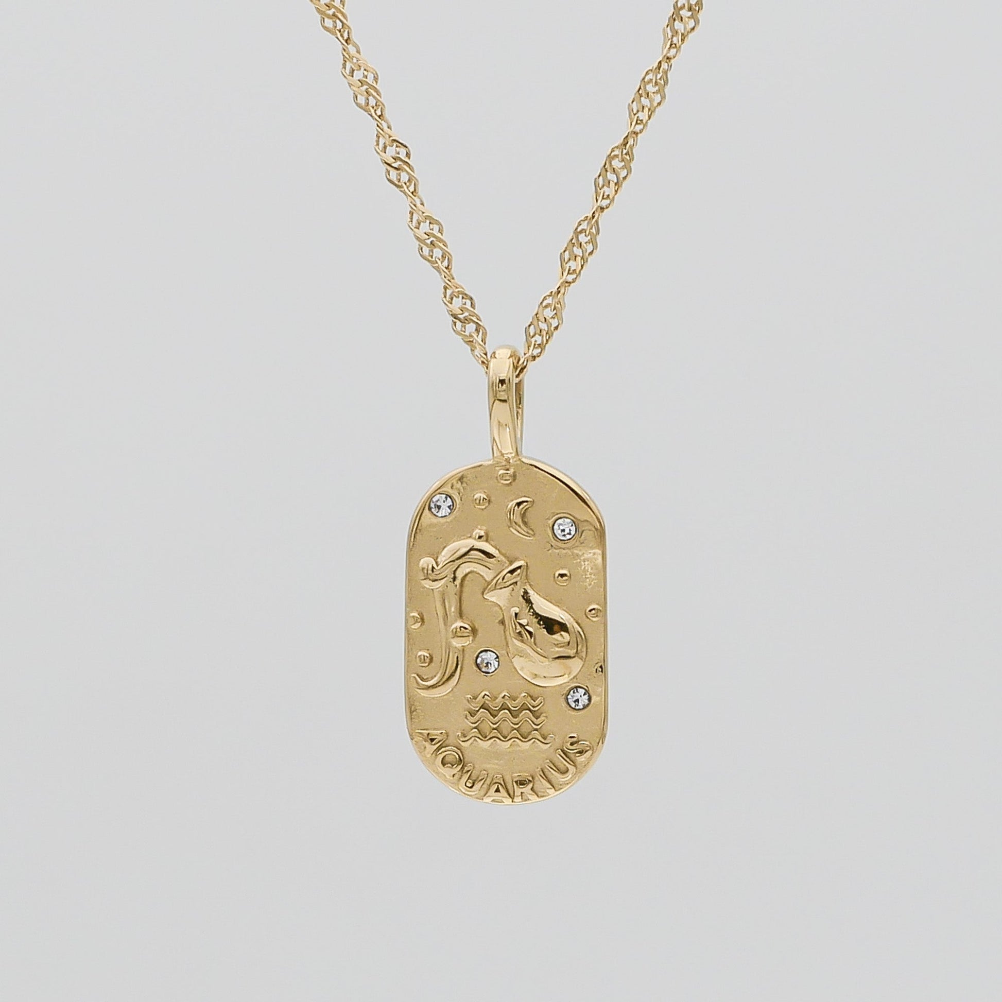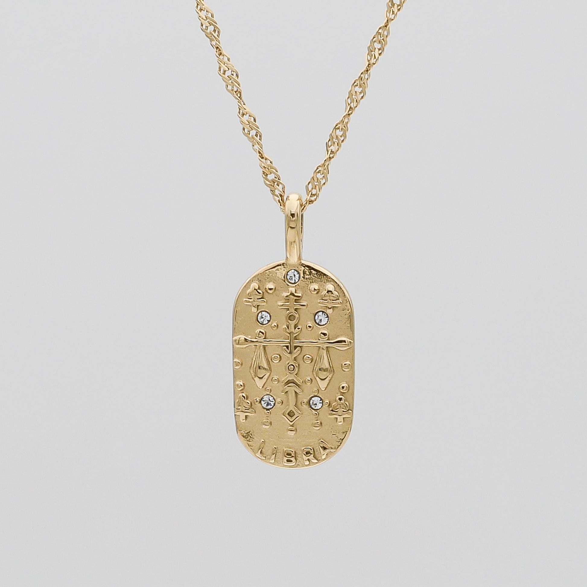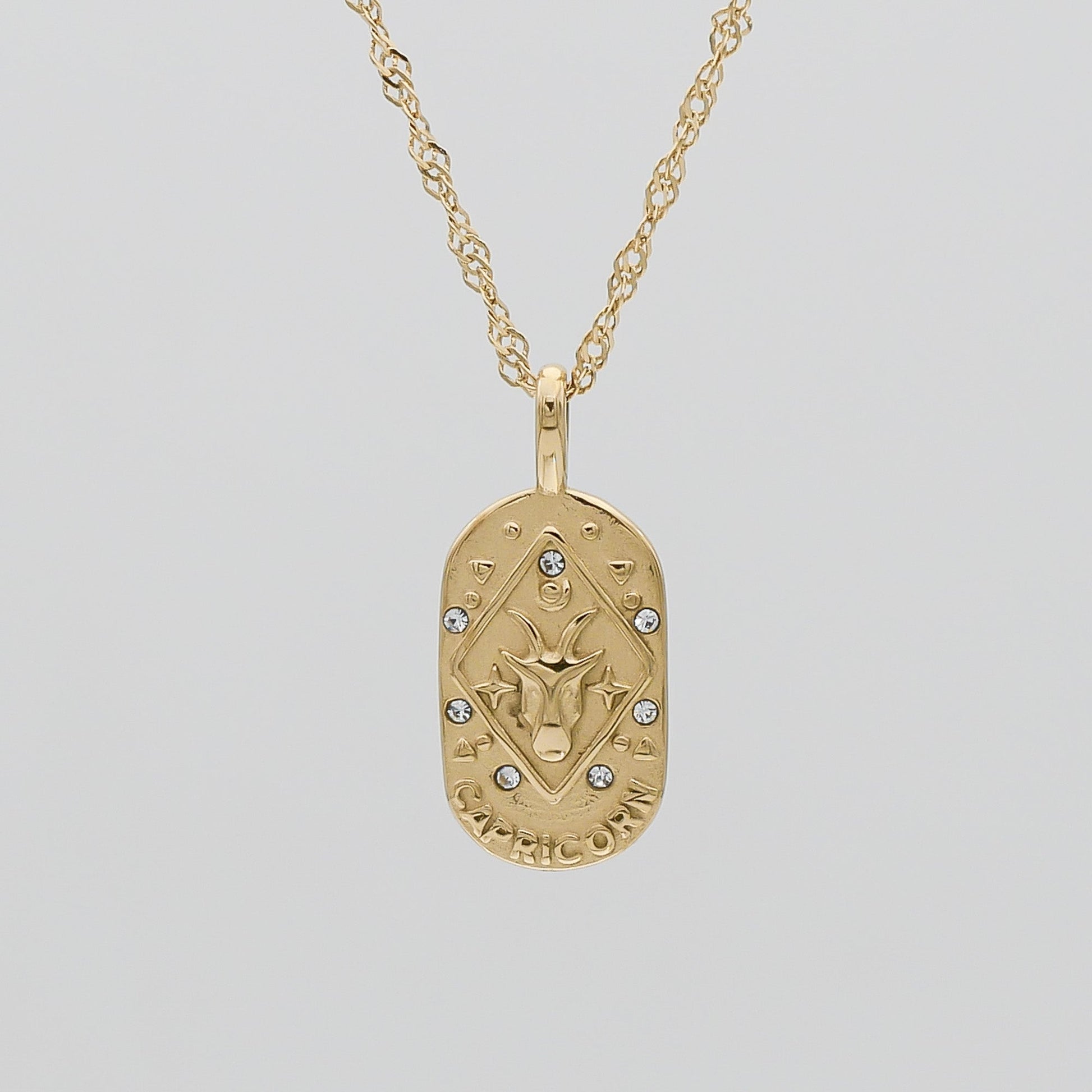 The Zodiac Tarot Card Necklace is crafted in 18k gold plated stainless steel. It features elaborate detailing on a tablet charm suspended from a captivating wave chain. With its textured weight, the bold chain counters the dainty detailing of the pendant. The pendant has a small loop that connects to a larger hoop that lays through the chain. The tablet is oval-shaped and features a design that illustrates the zodiac it represents, all of which have solid and cubic zirconia jewelled circles surrounding the main feature as well as the star sign symbol.