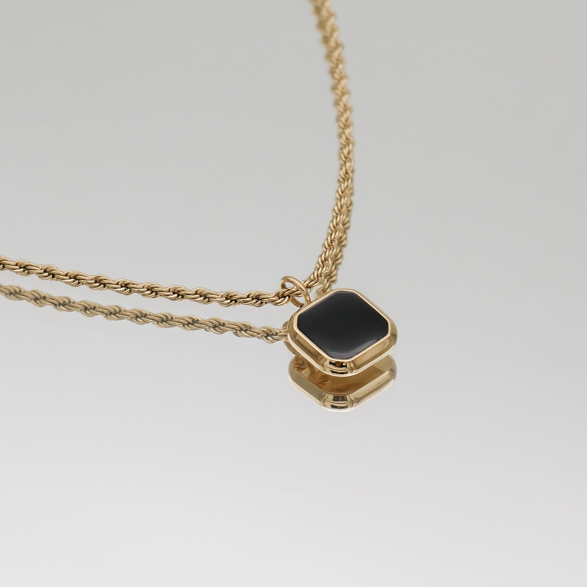 The Zola Onyx Necklace is a bold statement piece, blending classic design with modern touches. Featuring a chunky, textured twisted rope chain, it complements the striking bezel-set cubic zirconia gemstone, inspired by Onyx with its deep black hue. The pendant’s rounded square shape, framed by gold, adds elegance. Fastened with an easy-to-use trigger clasp, this modern statement necklace can be worn on its own or layered with other pendants to create the layered necklace look. Perfect for making an impression.